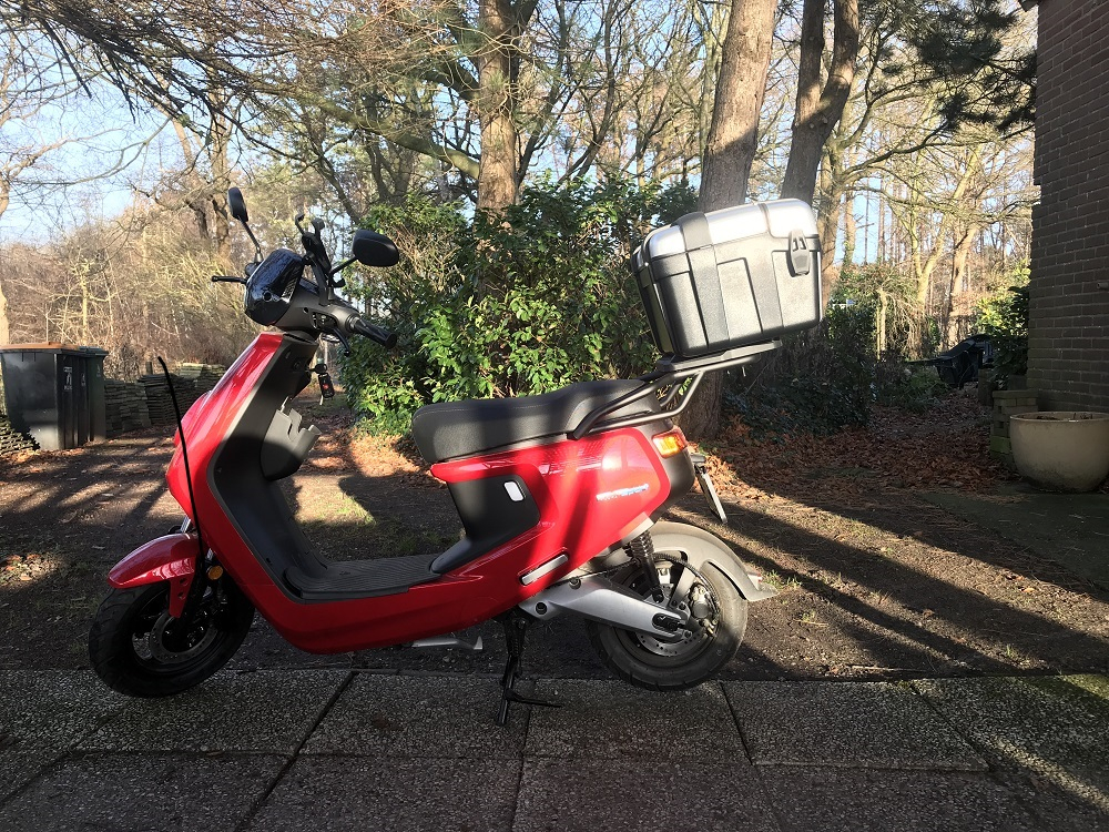 Der Bikeport, der einmal für einen NIU M1-Pro gebaut wurde, beherbergt nun einen N-GT - natürlich mit dem Koffer hinten drauf.
