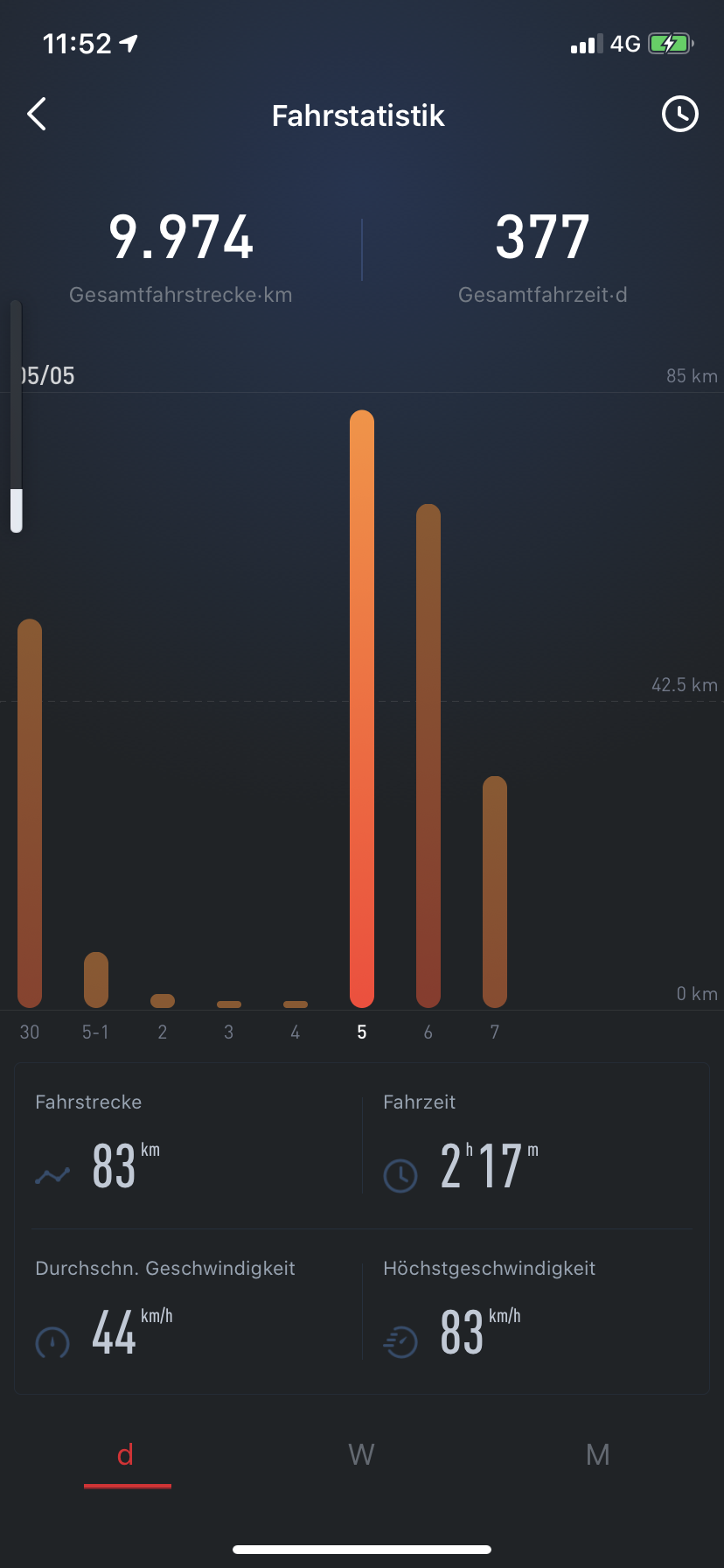 Ein typischer Tag auf die Arbeit und zurück, sieht so aus:. Man beachte die Durchschnittsgeschwindigkeit dank hohem Autobahnanteil.