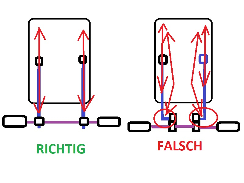 Nur zur Sicherheit: In dem Bild oben (demontierter Zustand) sind die beiden Gestänge offensichtlich um 90 Grad nach innen gedreht, normalerweise zeigen diese natürlich auf den Fahrer zu. Trotzdem ist da ein 90 Grad Winkel, der jedesmal, wenn das Schild leicht vor- und zurückschwingt, diese Kräfte "gehebelt" auf die Befestigung weitergibt.