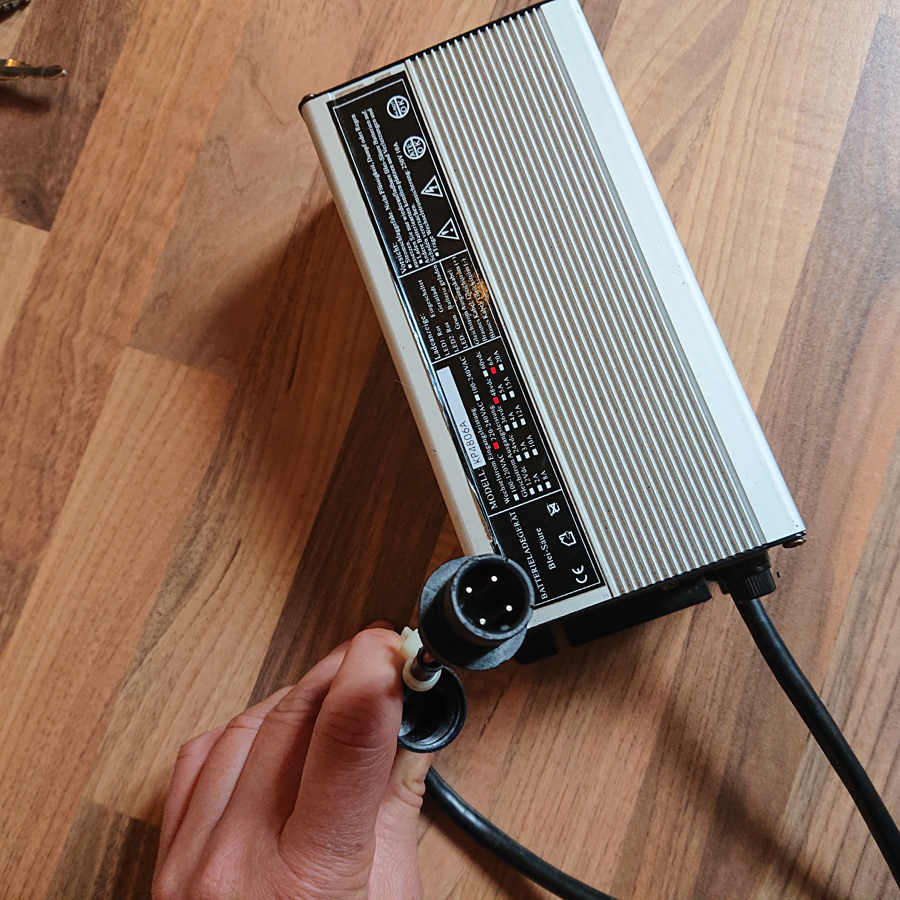Leider kann ich ihn nicht laden, da der Stecker vom Ladegerät abgegangen ist. Der Stecker hat vier Zugänge, das Kabel aber nur zwei Kabel (eins + und -).