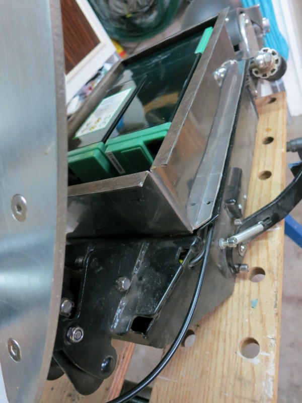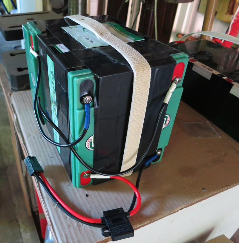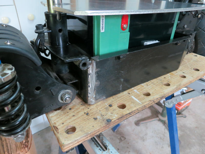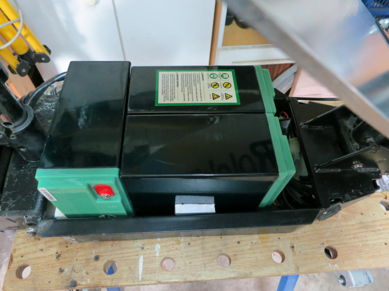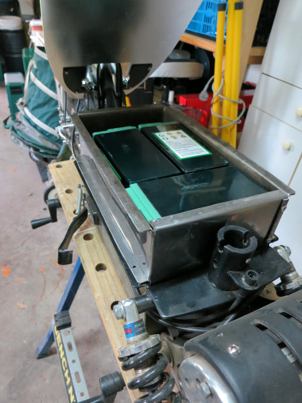 Also musste auch meiner aufgerüstet werden. Nur wie? Die Akkus sind ja noch neu und wollte ich auch jetzt nicht komplett austauschen. Außerdem hätten wir das mit dem Schweißen so nicht hinbekommen. Jetzt haben wir eine Box aus Holz gebastelt und die Akkus dort in getrennten Fächern übereinander gestapelt.
