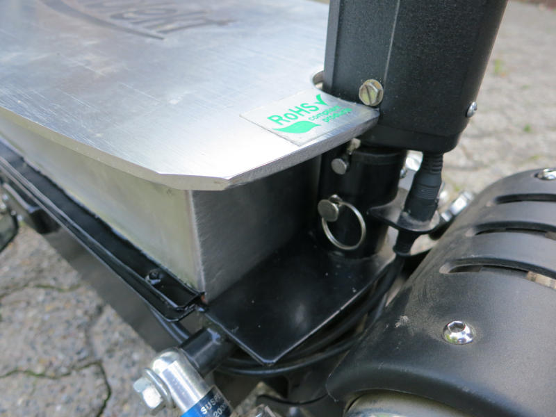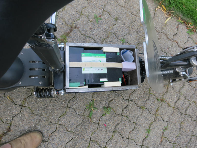 Im Akkukasten ist jetzt auch noch Platz für Werkzeug und eine Fotokopie der eScooterpapiere.