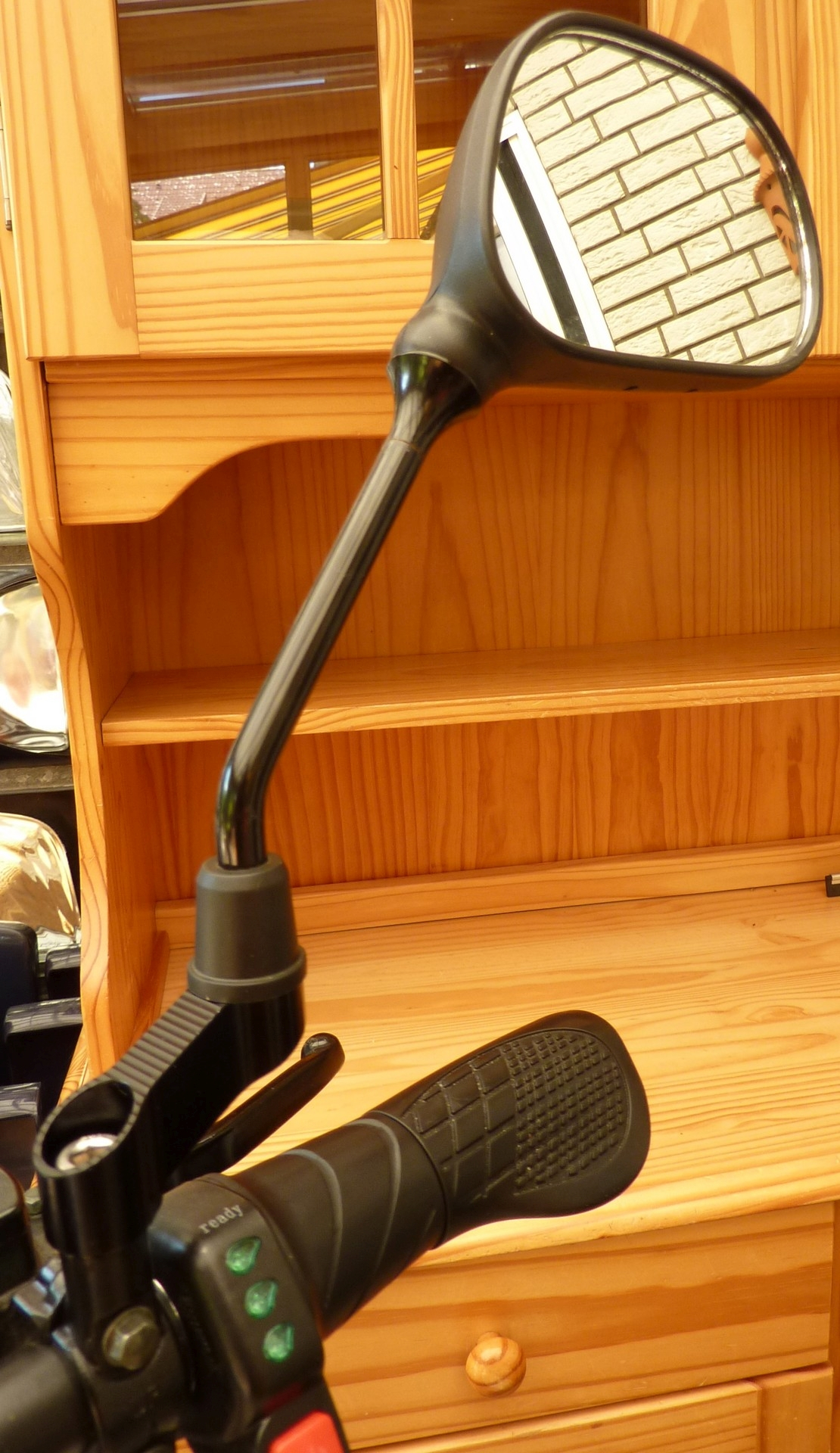 Ich habe bzw. hatte auch das Problem, beim Blick in die Rückspiegel hauptsächlich meine Oberarme zu sehen. Damit ist jetzt Schluss! Eine Weile habe ich über eine selbstgeschnitzte Spiegelverlängerung nachgedacht. An welcher Stelle trenne ich die Revo-Spiegelarme auf, bzw. wo kann ich ein Stück Rundstahl einfügen, um die Spiegel weiter nach aussen zu bringen? Alles Quatsch!