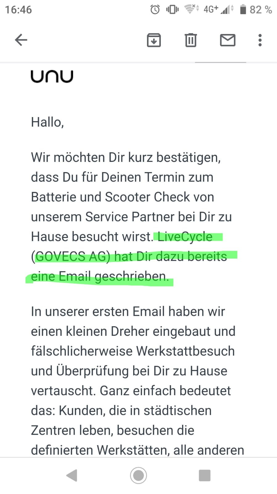 Heute in der Mail von Unu stand damit nur noch mal die Bestätigung, dass man mich bei mir zu Hause besucht. In der ersten Mail vom 10.6. hatte man mir schon angedeutet, dass ich die Werkstatt besuchen soll (hier in Dresden Bosch) - da hab ich mir logischerweise keine Gedanken gemacht.