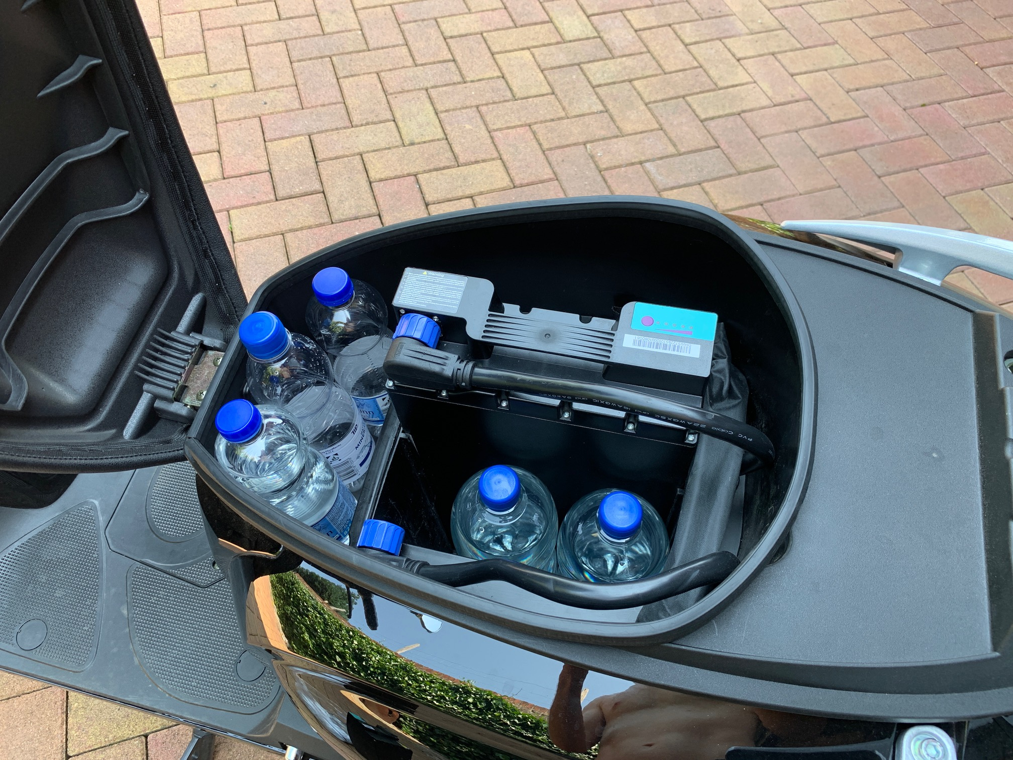 Ein Kasten (30 cm breit) passt nicht hin. Ein 1,5 l-Sechserpack schon. Das Foto dazu füge ich unten an. Insgesamt hast du ca. 24 cm zwischen dem lackierten Gehäuseteil an den Fußspitzen bis zur Abdeckklappe der Ladesteckdose.b) Ist im "fussraum"genügend Platz für eine Sprudelkiste?