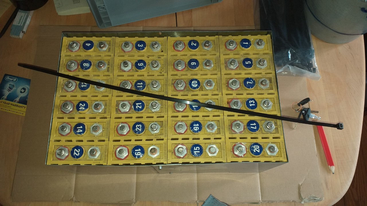 Jetzt sind die Zellen in meiner originalen Reihenfolge (ich hatte sie dem Alter/Seriennummer nach sortiert, 1 die erste, 24 die neueste, alle innerhalb etwa eines Monats) eingebaut, mittels Kabelbinder verzurrt, und mit den Stromschienen verbunden. Mit 13,13V sehr nah am 13,2V Zielwert dran, bei ca. 60% Ladestand
