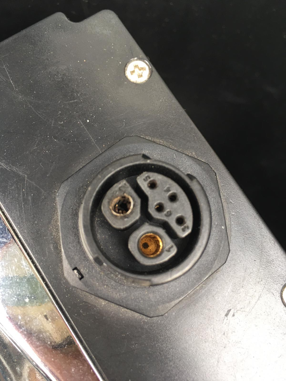 Fehlersymptome: schwarzer Kontakt auf der Steckerdseite, knisternde Geräusche aus der Buchse im Betrieb, Stecker und Buchse werden unhandlich 'warm' und plötzlicher Stromausfall im Roller.