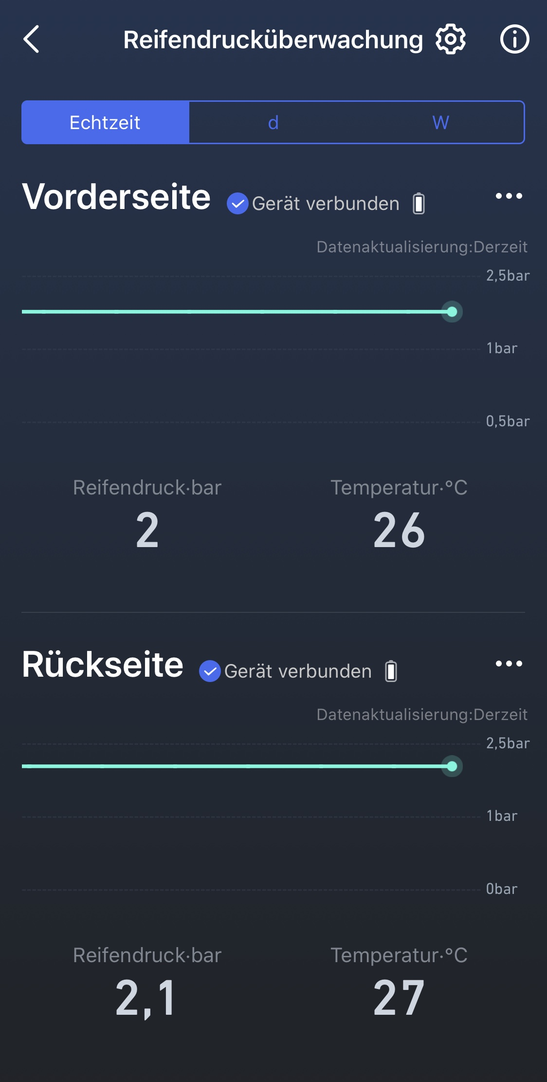 Nun gut, dann bin ich flott an die Tanke um die Ecke und hab vorne 2,1 bar und hinten 2,3 bar drauf gemacht. Diese Werte wichen aber bei den Sensoren auch ab. Die zeigten vorne 2 und hinten 2,1bar an. Beim in den Keller rücken sogar hinten nur 2 bar. Als Temperaturfühler sind die Teile allerdings gut.