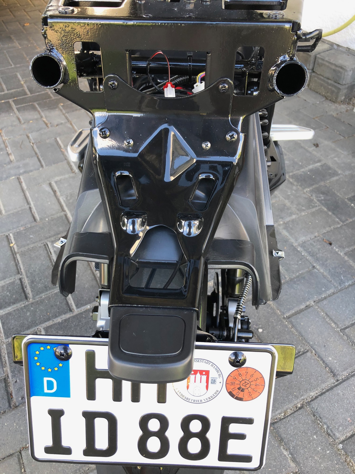 Werde noch mal ein paar Fotos reinstellen. Die Vader Rücklichteinheit hat unten eine weiße LED Einheit die die Kennzeichenlichteinheit ersetzen kann...ich habe den Einsatz unterm Rücklicht vom NGt bestellt und versuche es so. Fehlt nur noch eine Platte die Rahmen und Spritzschutz des Hinterrades fixiert. Näheres wenn die Teile geliefert sind