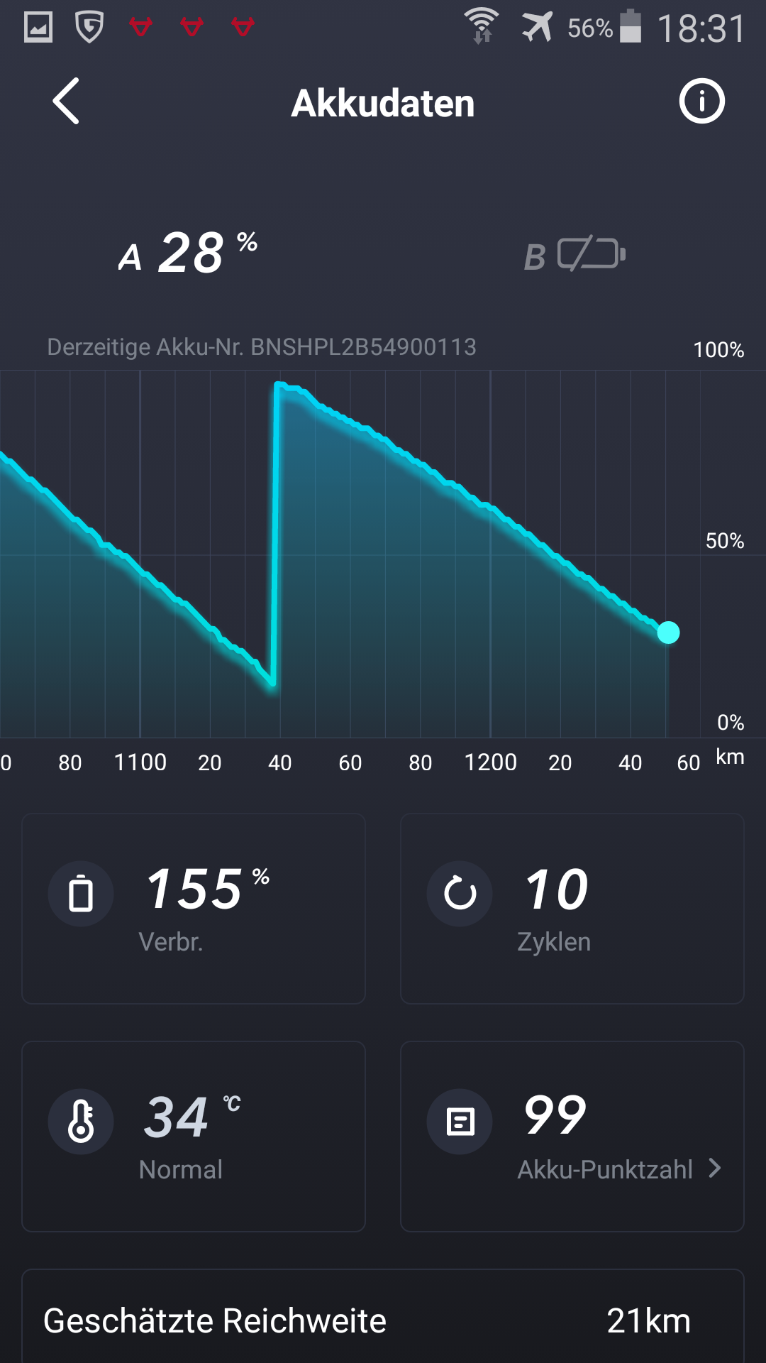 Mal steigen beide Akkustände im Stand innerhalb von Minuten, ohne ans Ladegerät angeschlossen zu sein, dann geht der eine über Nacht 10% runter… oder beide starten bei 100% und nach 3 km ist Akku A immer noch bei 100%, B bei 93…