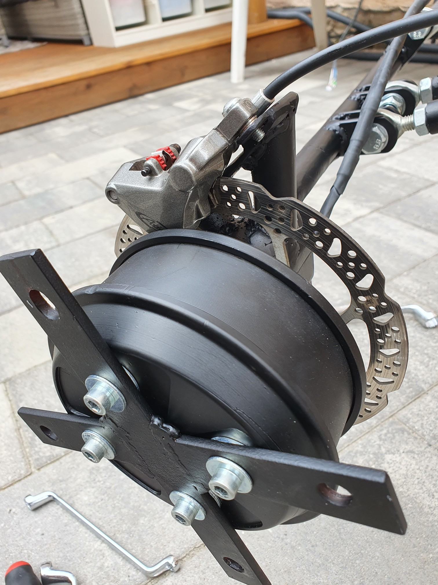 Mein Kollege der mir die Aufnahme zum befestigen der Bremsscheibe am Motor gedreht hatte, hat lange auf sich warten lassen. Letztes Wochenende hab ich das letzte fehlende Teil nun endlich bekommen.