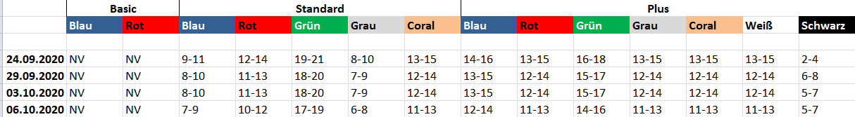 Wie man sehen kann, gehen alle Zahlen (bis auf den schwarzen, daher denke ich, dass das damals eine Fehleingabe seitens Unu war) runter, so wie man das erwarten würde. Mein Liefertermin (blau 3kW) war seit Bestellung auf Ende November/Anfang Dezember und da ist er noch immer. Das passt also.