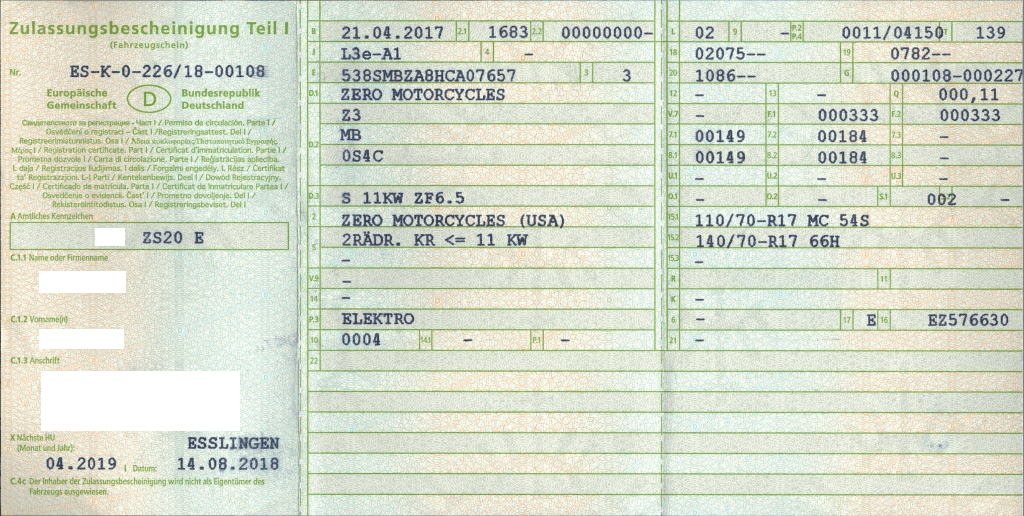 Ich habe am Freitag meine Zero S zugelassen. Es war eine Katastrophe - trotz zahlreicher Unterlagen von meinem Händler.