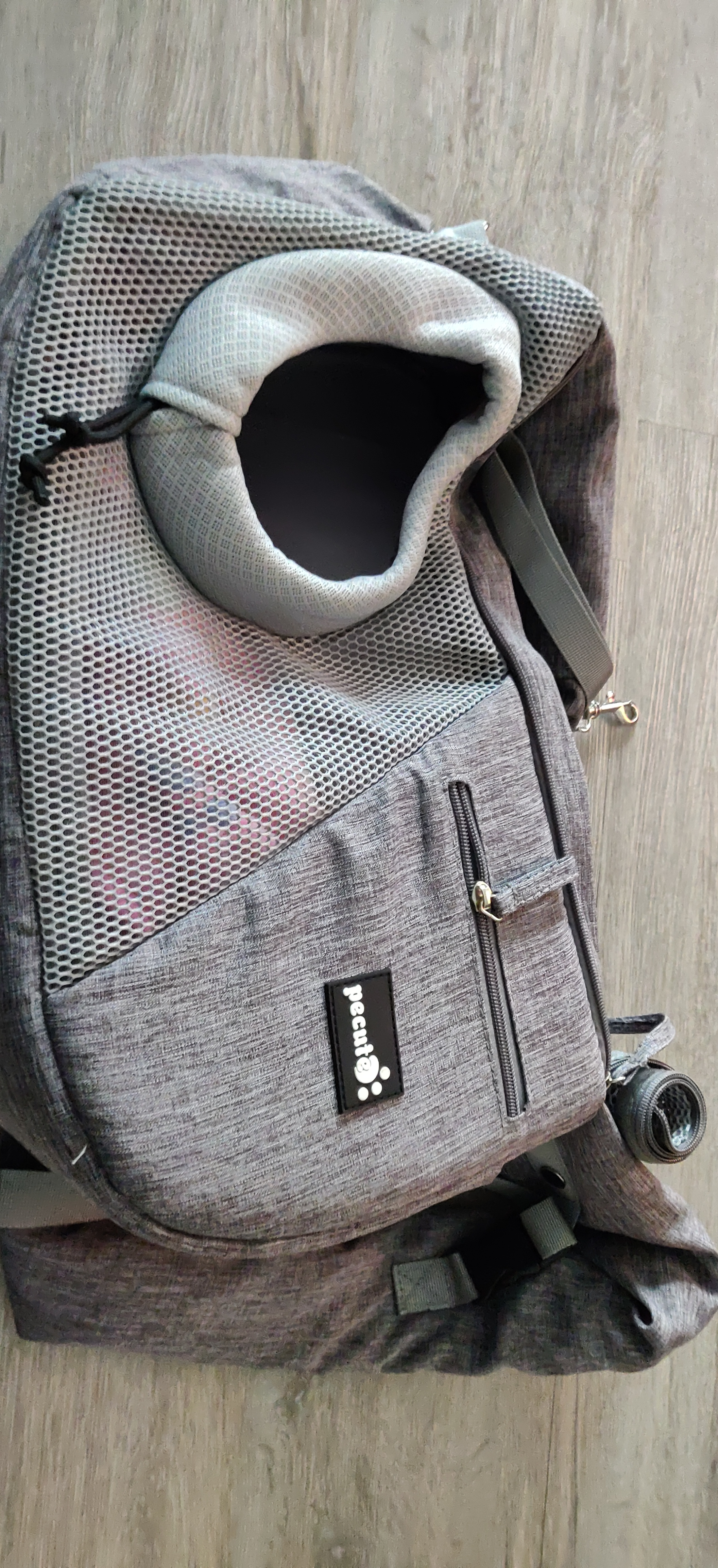 Oben kann man zu machen unten ein Loch für den Kopf. Meine sitzt aber immer in der Tasche und schaut raus Tasche ist verstellbar, und hat zudem Staufächer. Inkl Geschirrbefestigungsleine. Gibt's in verschiedenen Größen. Ich hab glaube die S. Hab grade Amazon geschaut, finde die nicht mehr, habe die von Amazon, ca 36 Euro.