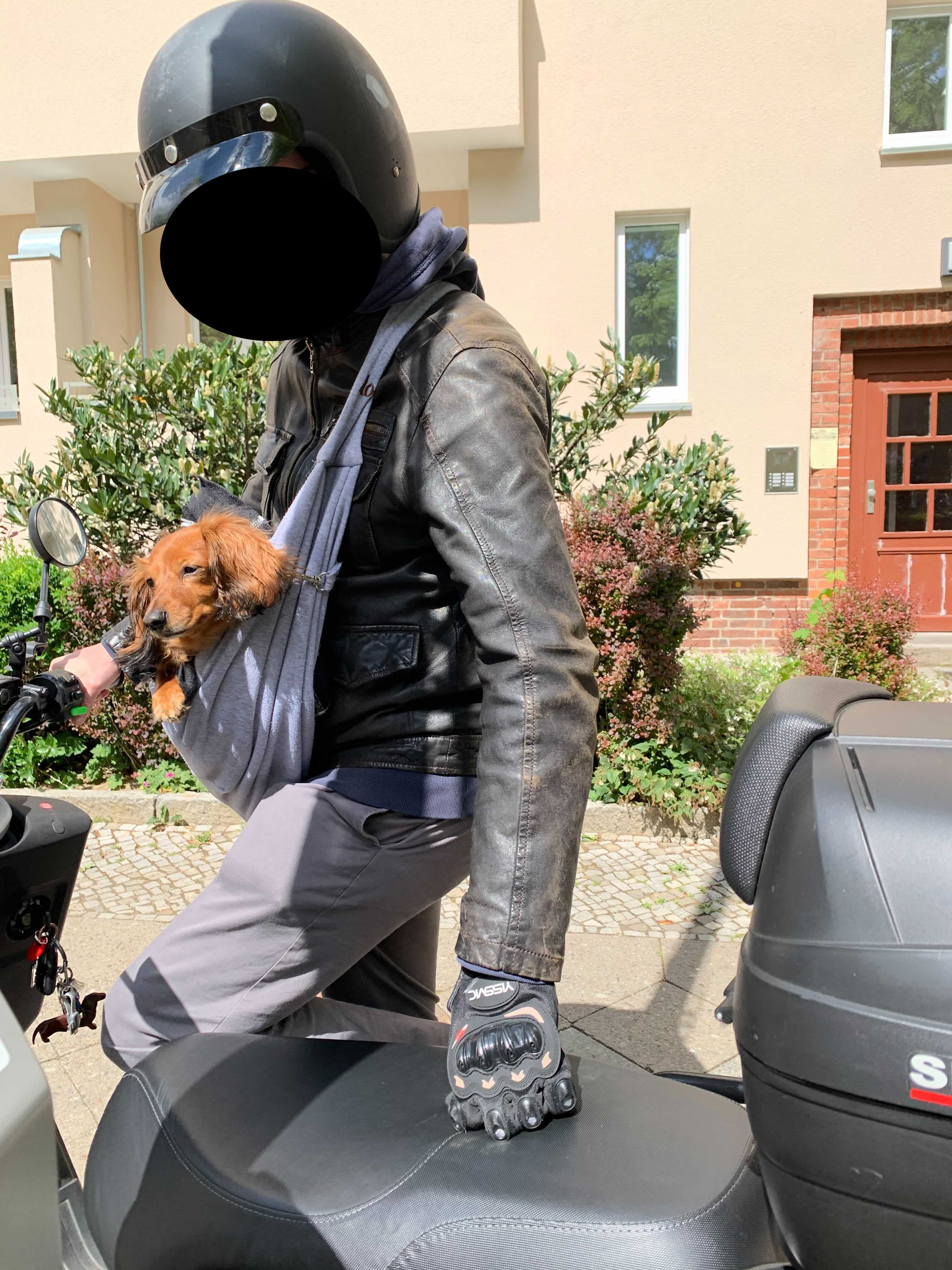 Nehme unsere kleine Dackeldame (knapp 6kg, ja, ich weiß, wir arbeiten an der Diet) oft mit auf dem Roller. Sie ist dabei in einer Tragetasche. Mit dieser ist sie auch an ihrem Geschirr befestigt. Während der Fahrt liegt sie dann auf meinen Beinen, aber ist immer noch stabil in der Tragetasche. Sie liebt es und streckt ihre Nase in den Wind. Wenn es etwas kälter wird, wickel ich sie noch zusätzlich in eine Decke ein.