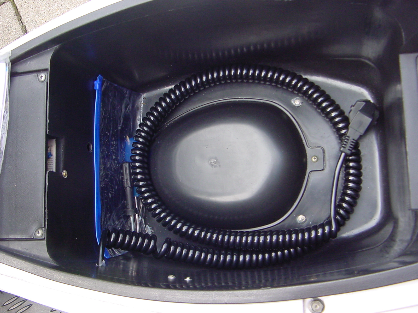 So sah mein jungfräuliches Helmfach aus: Das Spiralkabel verschwindet in der linken Helmfachwand. Mit den zwei Schrauben in der Helmfachwand (unten im Bild) hielten den Ladegeräte-seitigen SB50, und am Ende des Sprialkabels war der zweite SB50, den man dort dann eingesteckt hat vor der Montage des Helmfachs.