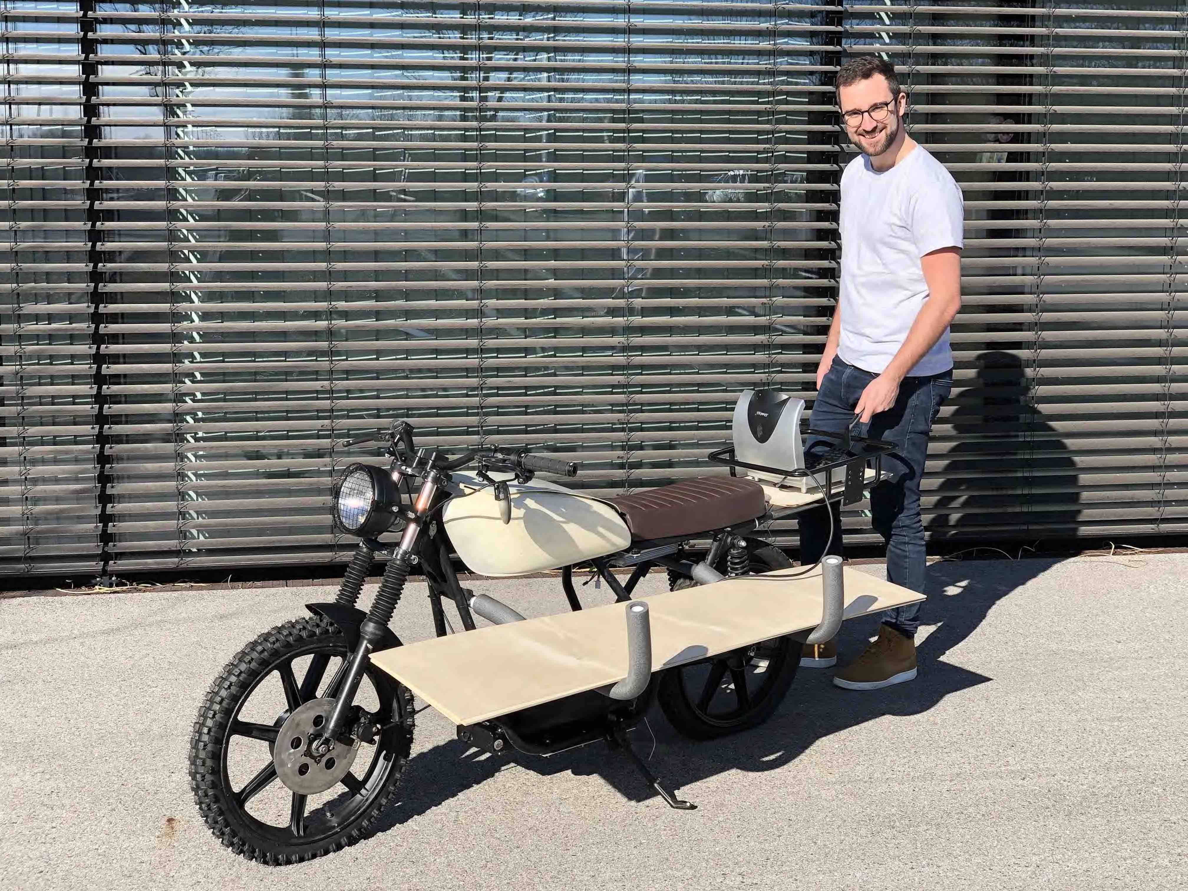 Er ist elektrisch, sieht aus wie ein Scrambler, aber man kann hinten und an der Seite ganz einfach Sachen transportieren. Da wir in der Stadt wohnen und öfter mal was transportieren müssen, dachte wir uns das wäre doch ganz praktisch.