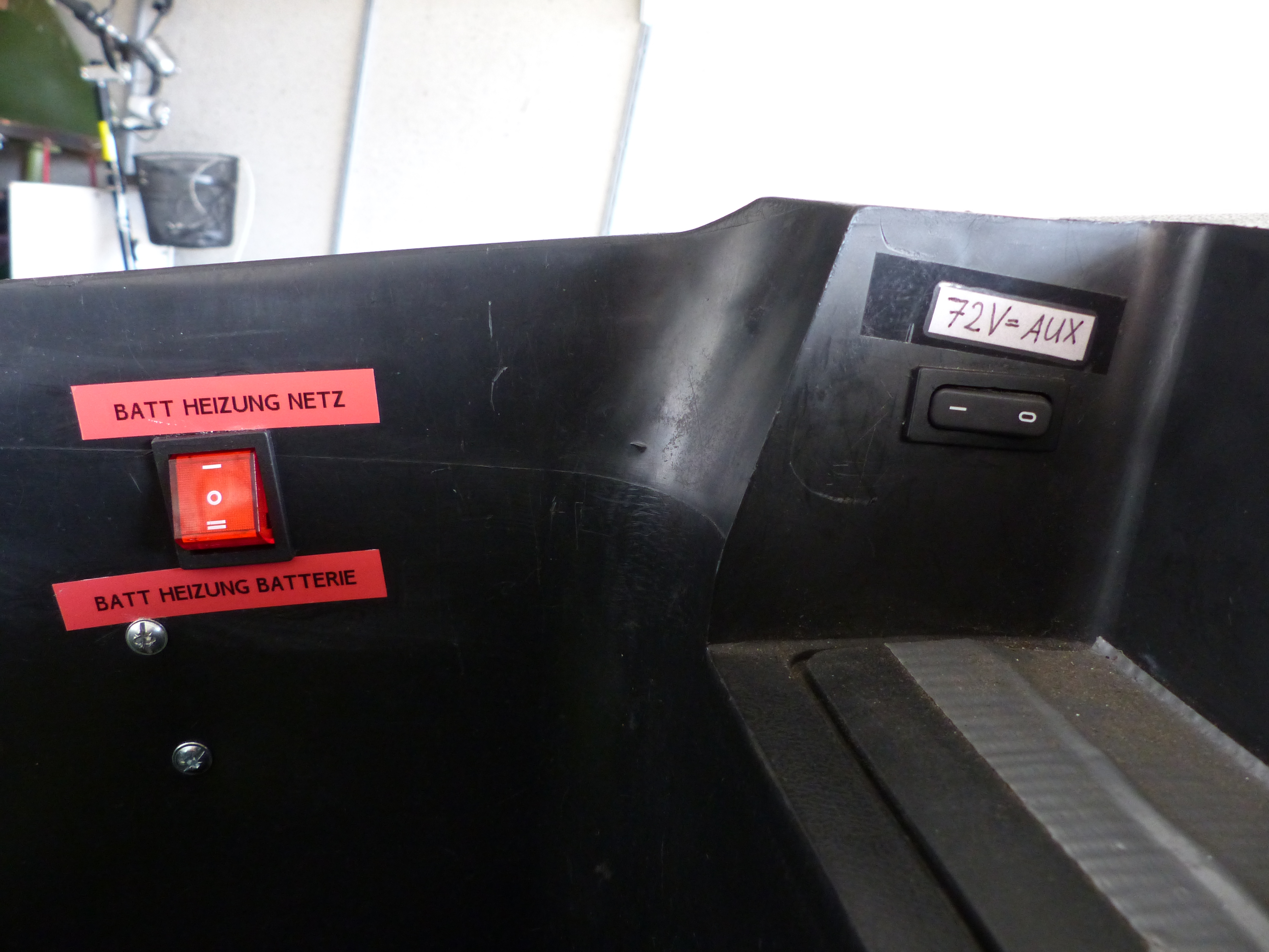 Oben auf dem Deckel des "12V Batteriefachs" tronte mein aus einem Conrad-Bausatz gebauter 12V Temperaturregler: Einstellung per Schraubendreher, rote LED zeigte Heizbetrieb an. Der kurze Netzstecker war für die netzbetriebene Heizungssparte. Das Emsiso BMS am Boden des "Helm"fachs (meiner ging da nie rein...) wollte ich schlicht im Blick haben, da eine Digitalanzeige dessen Gemütszustand preisgab. Es war vorher von außen nicht einsehbar UNTER dem Blech, AUF dem es im Bild tronte, was ziemlich sinnlos war. So nahm aber die notwendige Plexiglashaube darüber ein wenig des Helmfachs weg, aber kaum mehr, als es der vorherige blödsinnige Buckel-Deckel da unten tat.