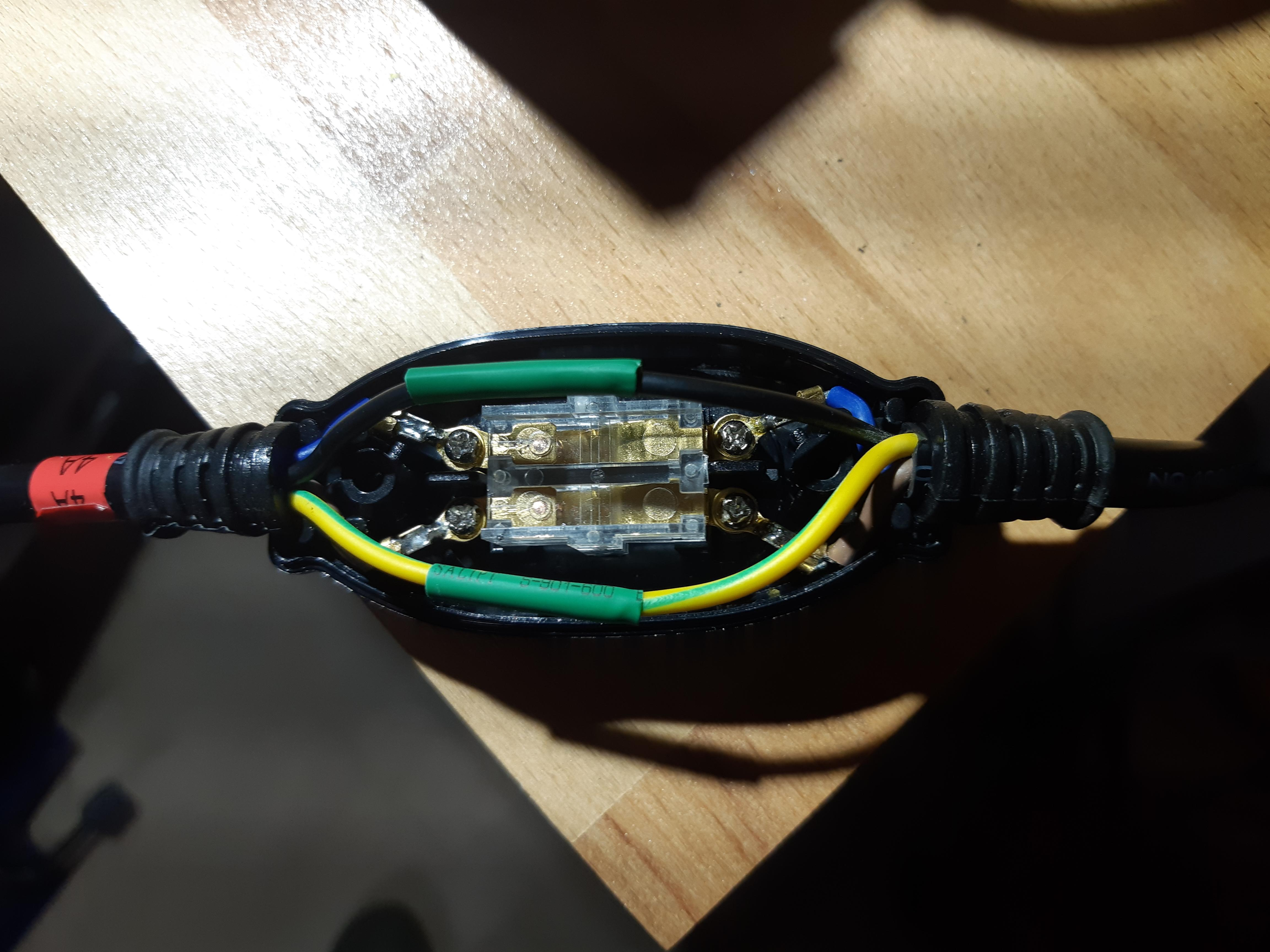Exakt, der Zwischenschalter ist etwa 10cm hinter dem Ladestecker montiert, und ja, die Leitung ist aufgetrennt und wieder verlötet worden. Schalter sieht aus wie ein Nachttischlampenschalter, ist aber zweipolig mit Gummiabdeckung.