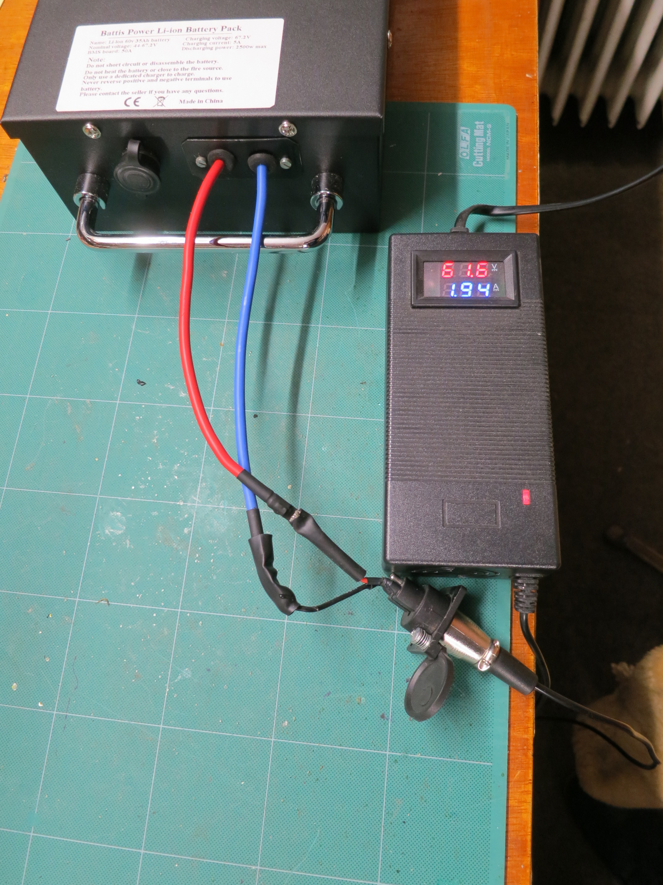 den neuen Akku muss ich leider noch etwas modifizieren. Für die Kaltgerätebuchse am Akkugehäuse habe ich kein passendes Kabel. 30A über einen Adernquerschnitt von 1.0mm² zu schicken kann nicht richtig sein, außerdem sind Kaltgerätestecker nur bis 10A zugelassen.