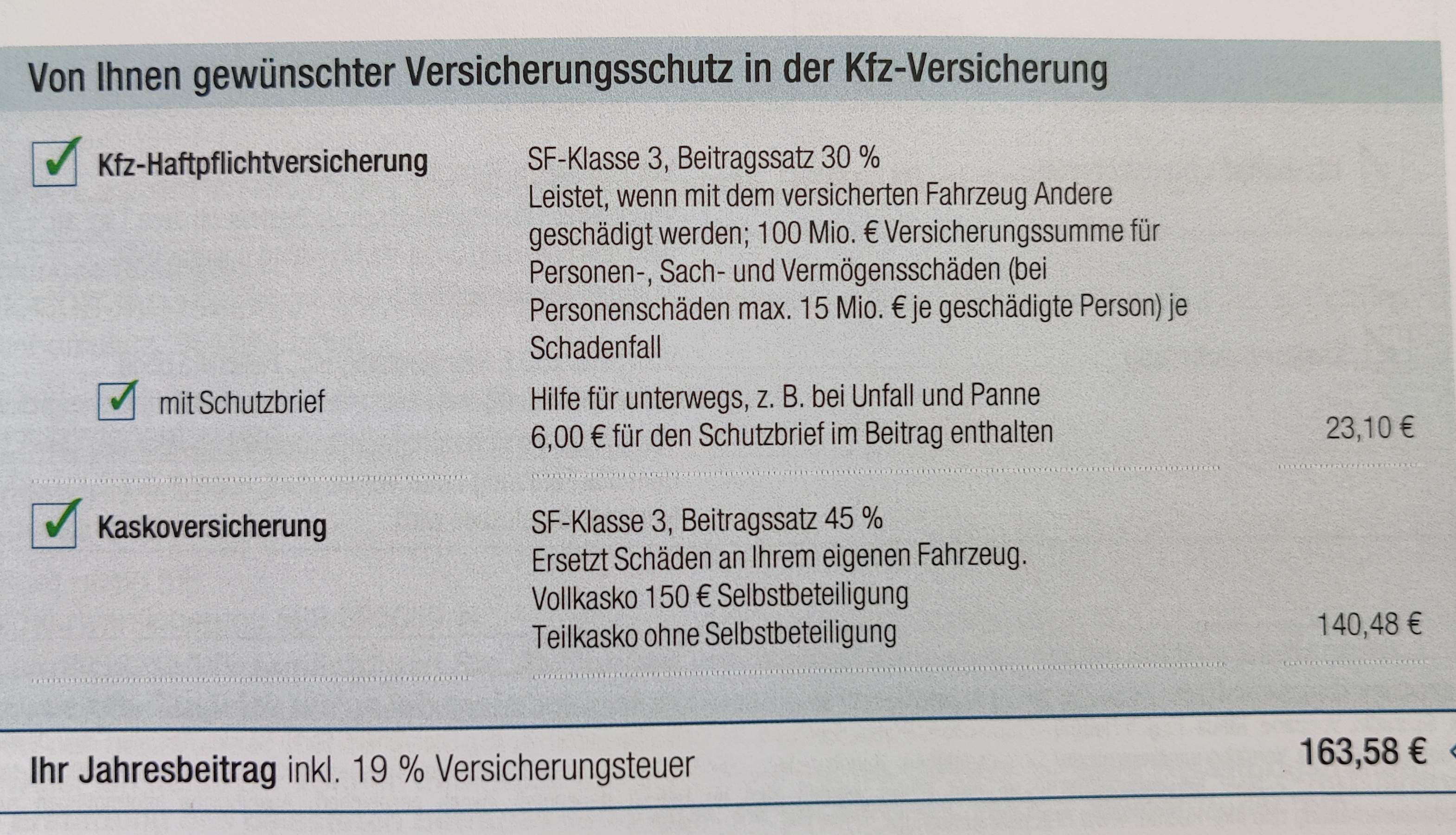 Teilkasko 150 € Selbstbeteiligung enthalten