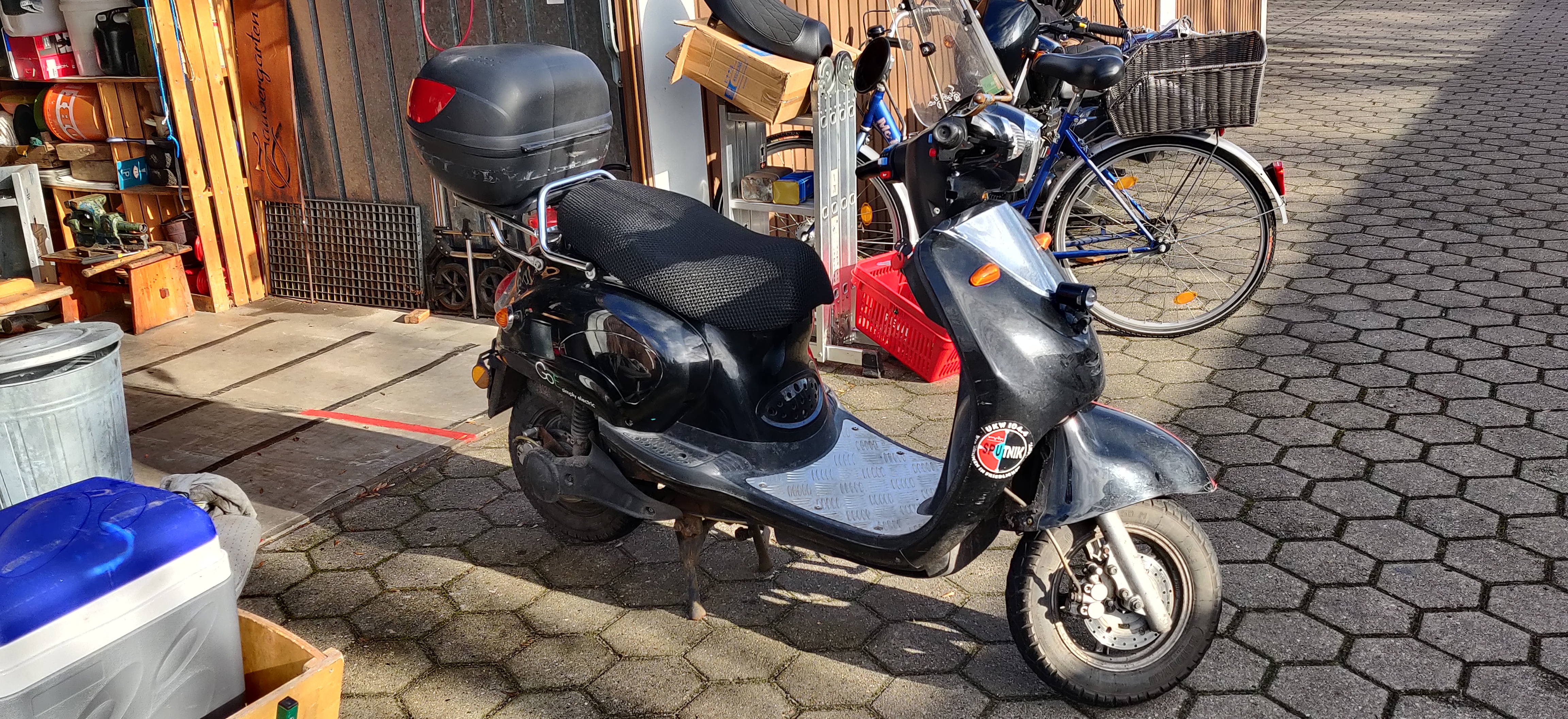 Bevor hier Staub liegt, das Chassis steht auf der Werkbank, der Motor hat frische Lager, der ist aber von Roller 2. Bremssättel sind sauber und beweglich, Beläge nach 4500 km noch gut. Zu den 2 GoE ist nun noch eine Nova dazu gekommen und nächste Woche werden die 3 Roller freiwillig zugelassen, dann gibt's einen frischen Akku ohne Blei und das Gerät wird dann auch wieder bewegt.
