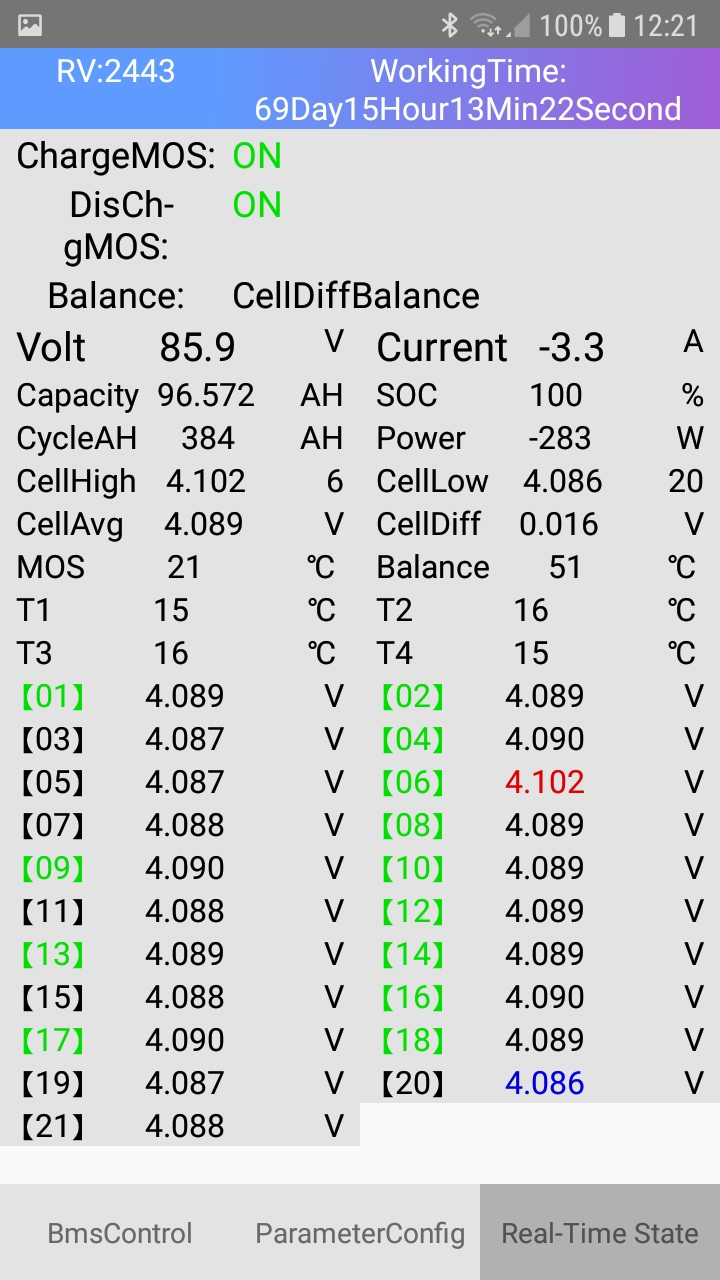 Ich will ich aber demnächst für die regelmäsige Ladung auf 84-85V mit einstellbaren 2,5/4/5,5A (4-4,05V /Zelle) reduzieren. Ich brauche das letzte Quentchen Kapazität nicht wirklich und das BMS hat zu wenig Power beim balancieren.
