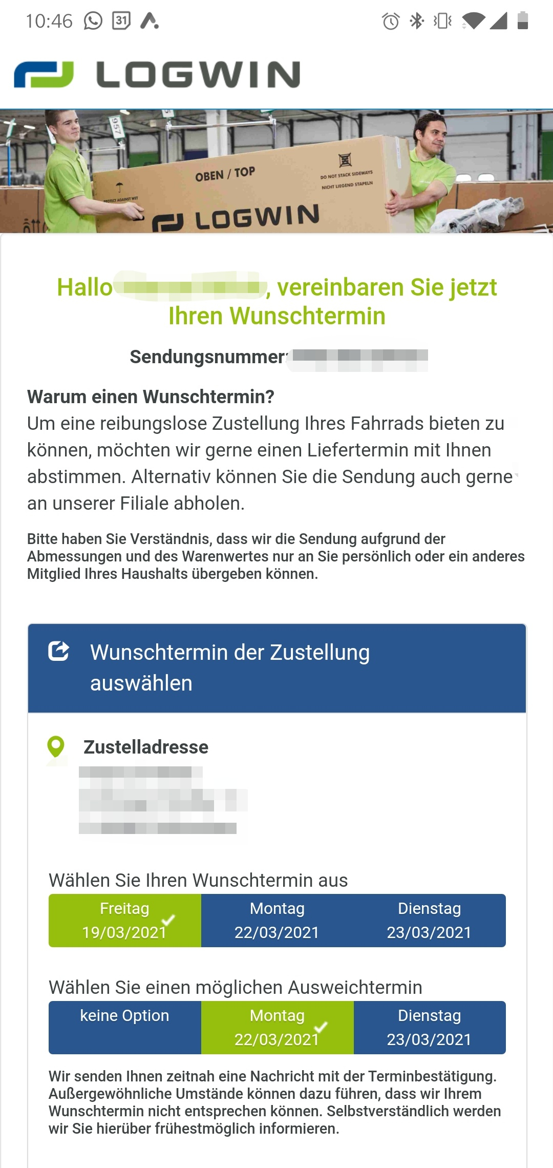 Nachdem wieder tagelang nichts geschah, fragte ich am 10.03.21 noch einmal nach. Plötzlich bekam ich auch eine Mail, dass mein neuer Roller reserviert ist.