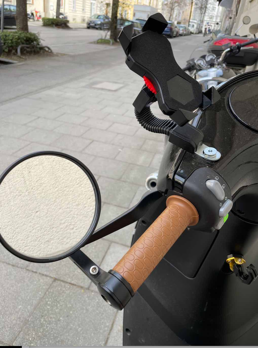 An den freien Spiegelschrauben hab ich nun eine Handyhalterung.