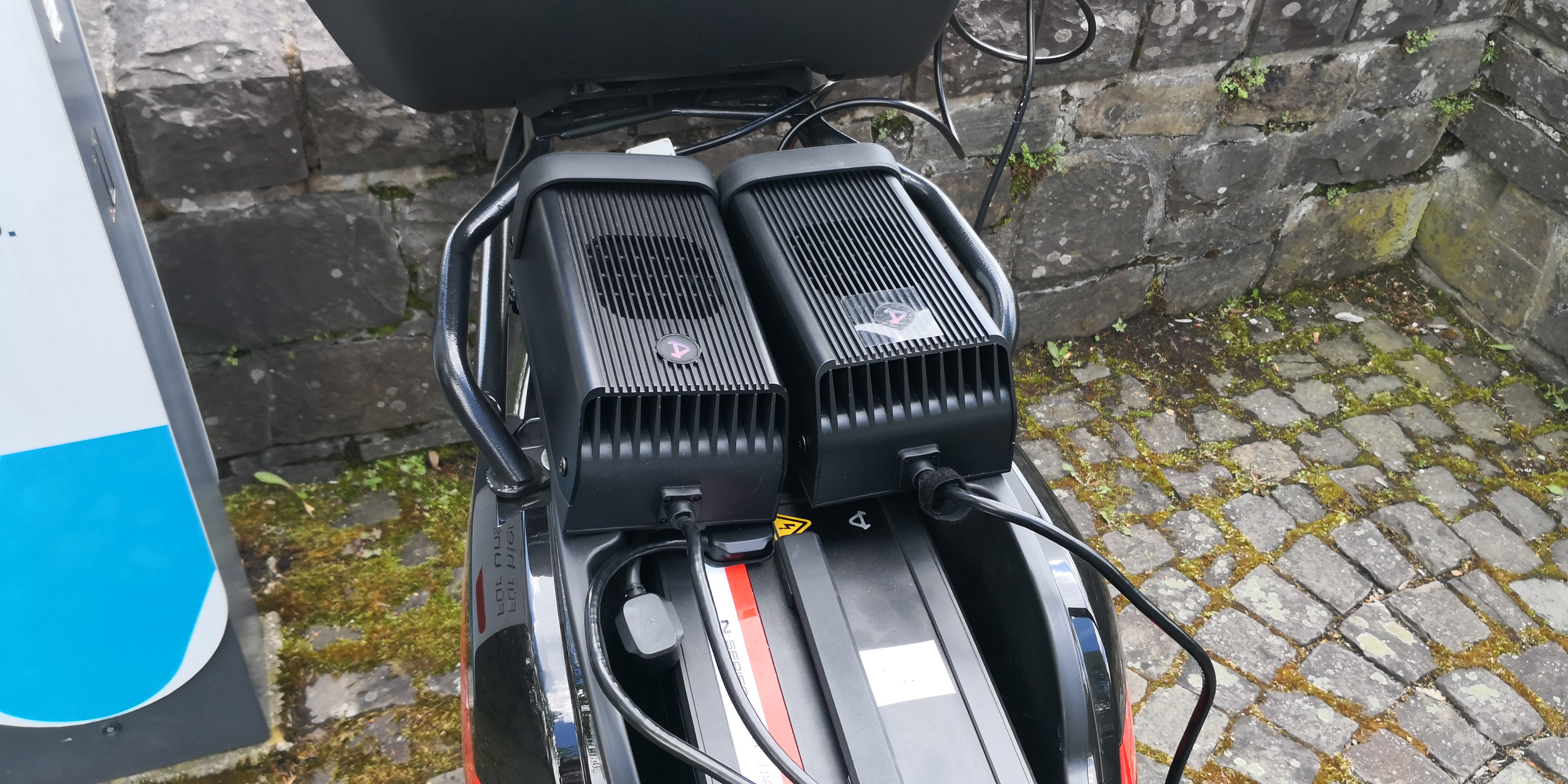 Darauf hatte ich keinen Bock. Ich bleib an der Ladestation beim Roller. Da ich fast ausschließlich mit Motorradklamotten fahre und damit is eh nicht so gut rumzulatschen. Ich hätte dann ja auch noch den Helm dabei. So bau ich mich dann an der Ladestation auf. Ladekabel ist dann größtenteils im Topcase, beide Ladegeräte an der frischen Luft.