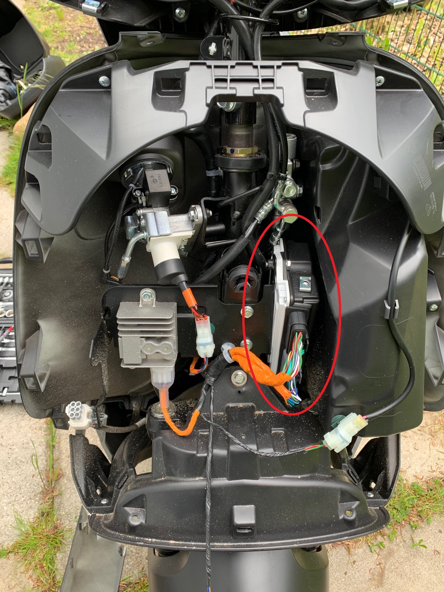 Anbei die Fotos von dem Umbau. Der Controller ist vorne hinter dem Vorderlicht eingebaut. Zum Ausbau muss die vordere Verkleidung abgenommen werden. Das meiste ist über Klipse befestigt. Da muss man etwas vorsichtig sein, damit die nicht abbrechen.