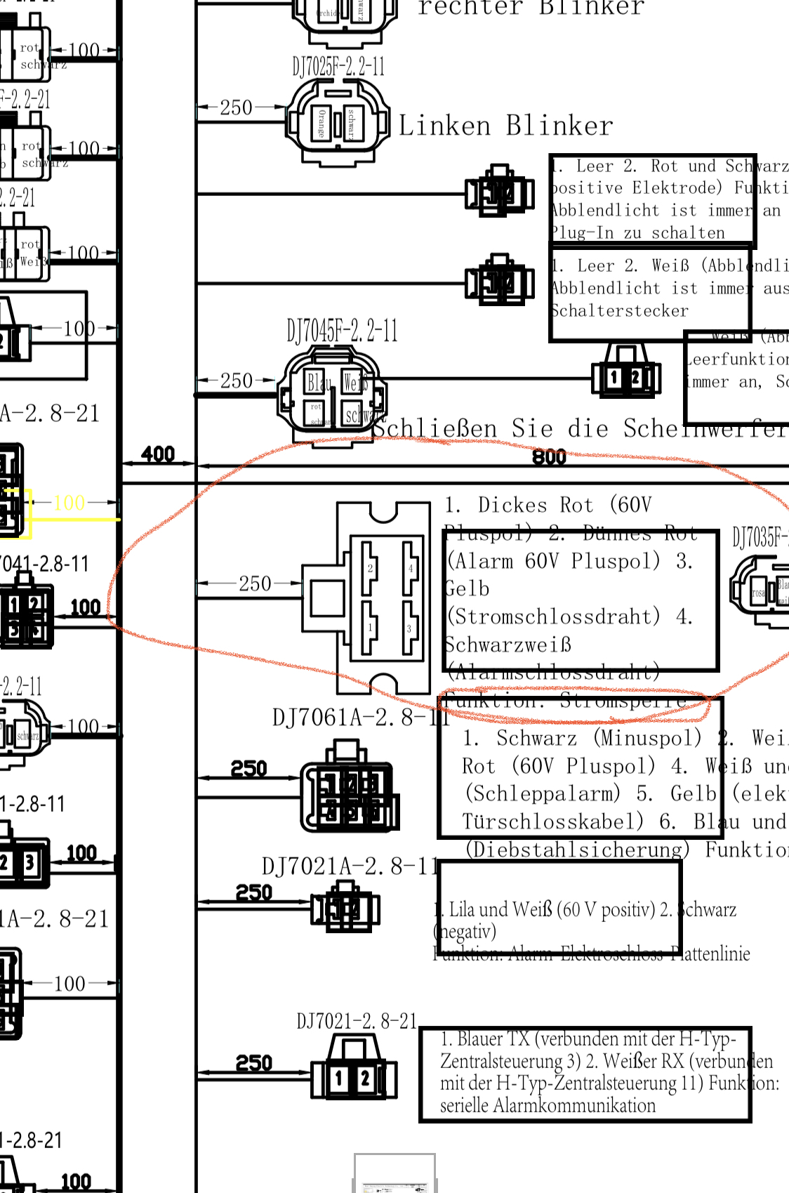 In dem detaillierten Kabelbaum ist zumindest von einem Stecker die Rede, der als Funktion Stromsperre ausgewiesen hat. Mir scheint als ob dieser Stecker bzw. dessen Kabel im Zündschloss münden. Auch wenn die Farben der Kabel nicht ganz hinhauen. Gelb statt grün. Der rest passt. auch die Form des Steckers.