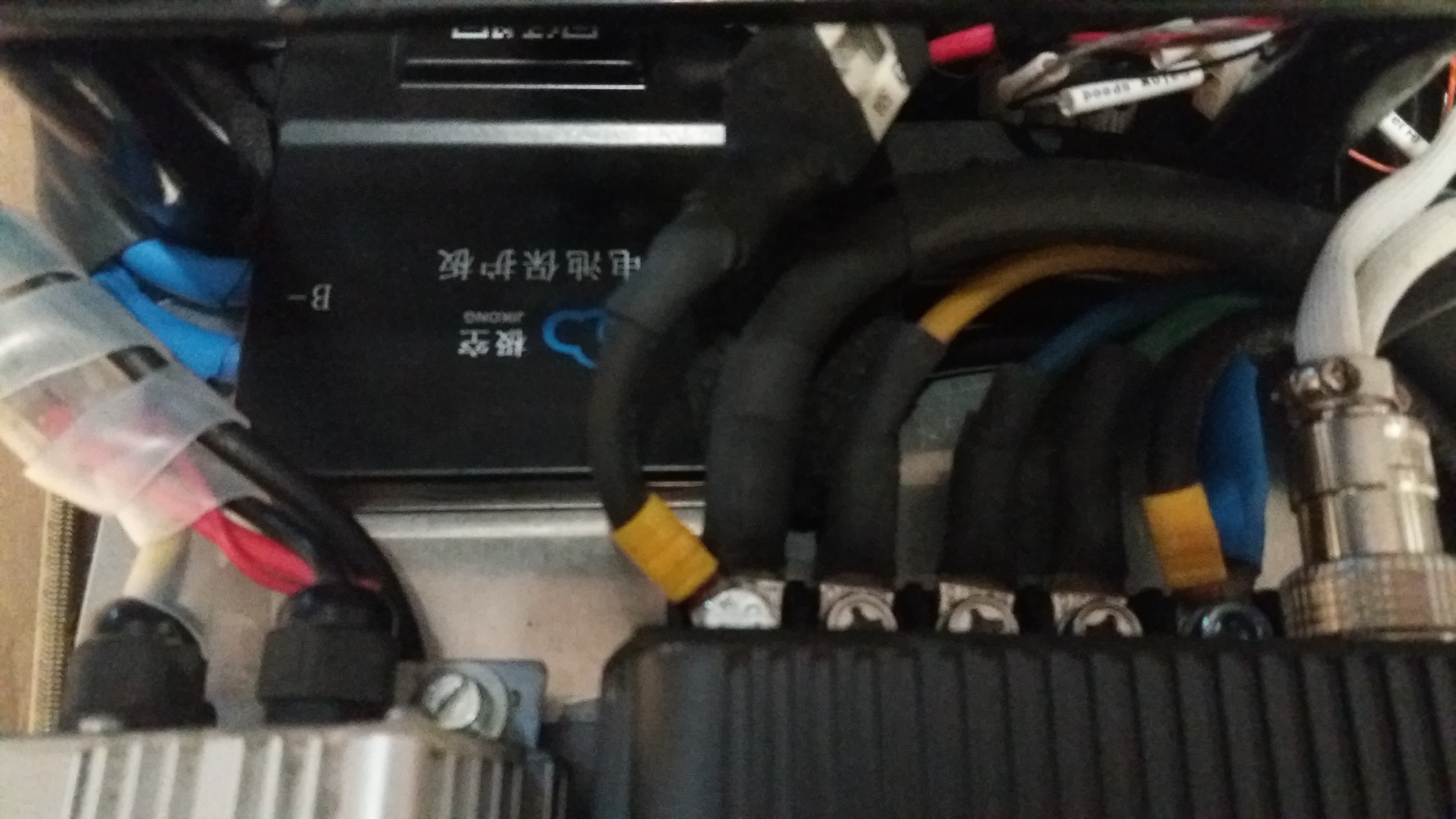 Die blauen 10qmm Leitungen habe ich mit zwei Lagen Schrumpschlauch überzogen und dann noch einen schwarzen Schrumpschlauch über beide Leitungen. Die liegen am Rahmenrohr zur Sitzkistenbefestigung an. Auf der anderen Seite drücken die Kabelschuhe vom,Controller mit einer Moosgummilage geschützt, das BMS auf das Montageblech des Controllers.