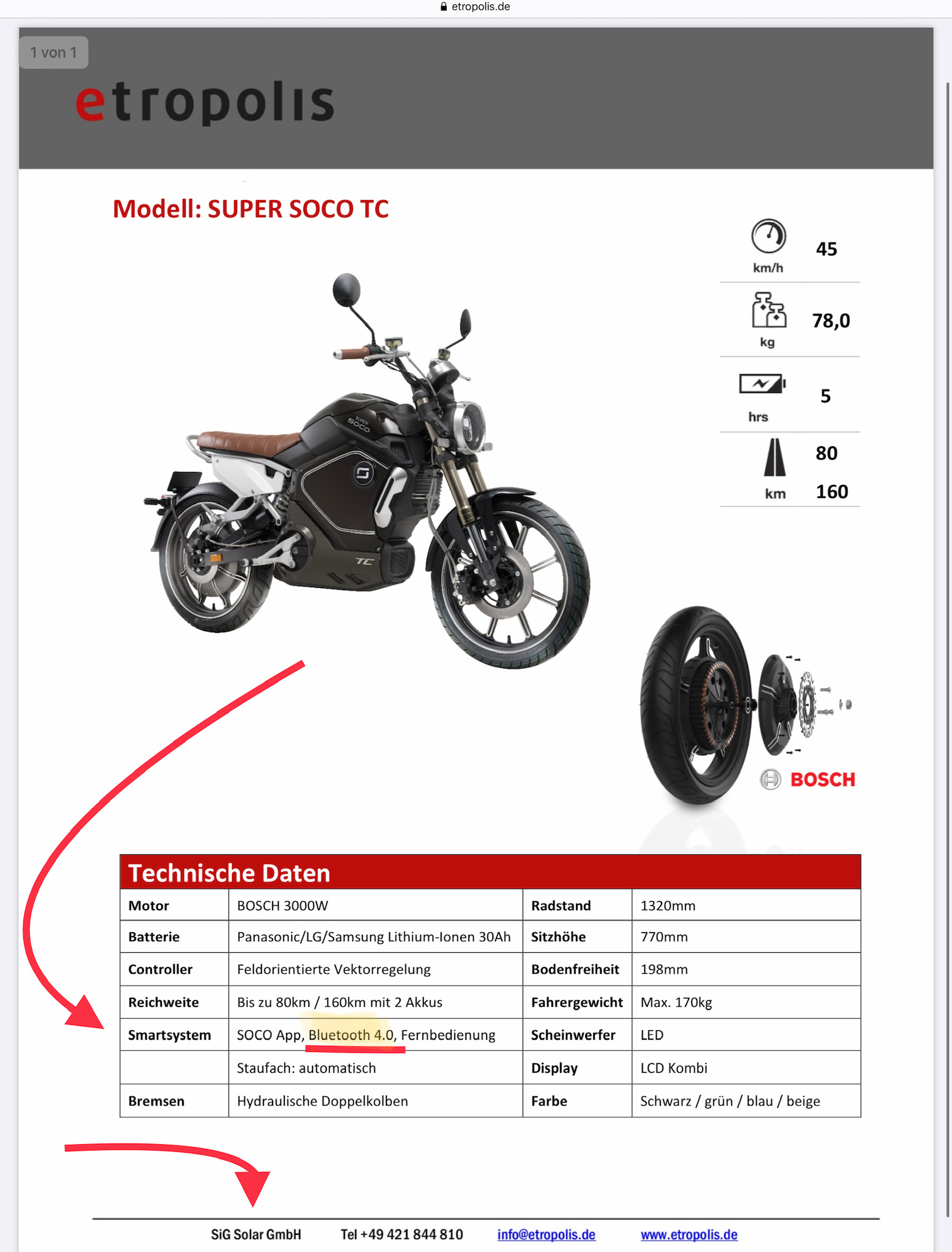 Ich fand das hier, vielleicht hilft das den Käufern von 2018 auch weitervsm hat geschrieben: Mi 8. Mai 2019, 21:01Ich habe zwar tatsächlich noch den offiziellen Prospekt von 2018, allerdings wird der Dir wohl so nichts bringen. Dort steht nämlich "Super Soco App is available subject to countries". Vielleicht findest Du hier im Forum noch einen Screenshot von der deutschen Webseite, wo die "Connectivity" ja auch (den deutschen Kunden) versprochen wurde. Wenn ich mich recht erinnere, stand da ja auch, dass die App zur Connectivity gegen Ende 2018 kommen sollte.felixyz hat geschrieben: Mi 8. Mai 2019, 13:59 Das fehlende BT-Modul werde ich mit erwähnen, dafür bräuchte ich das Prospekt von Super Soco Stand 2018, kann mir das jemand per eMail zukommen lassen? Danke im voraus!