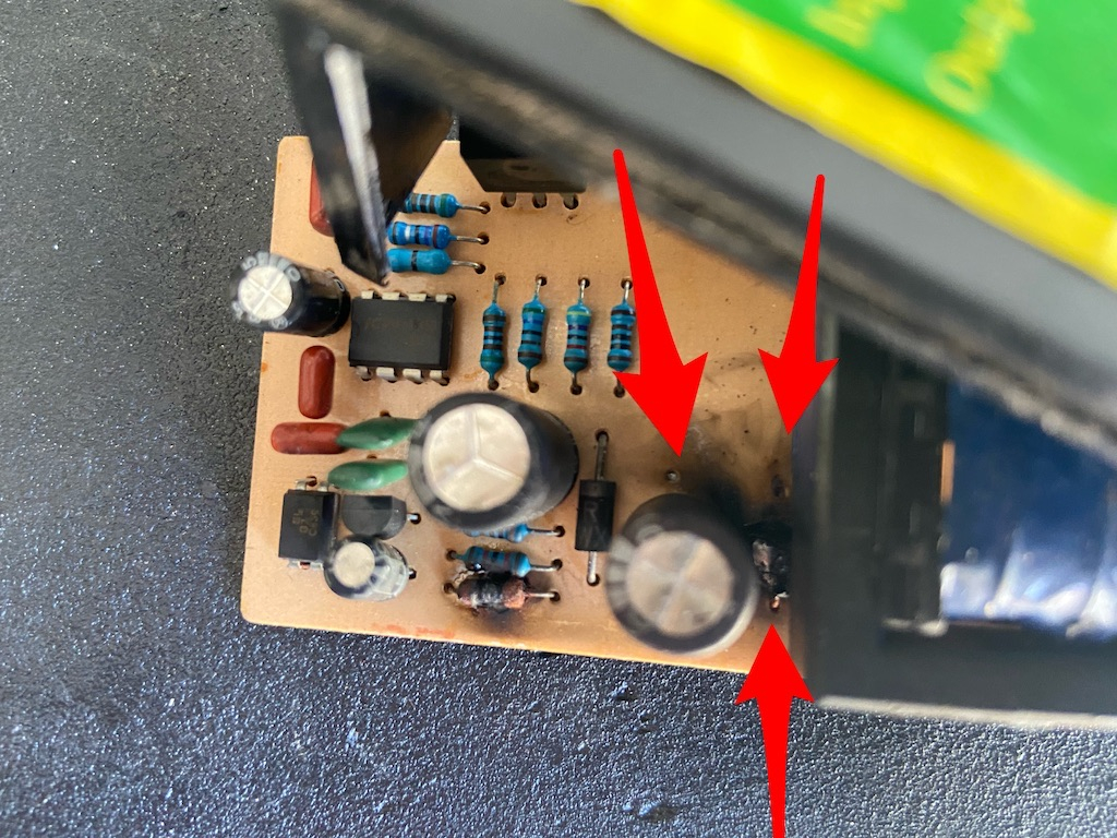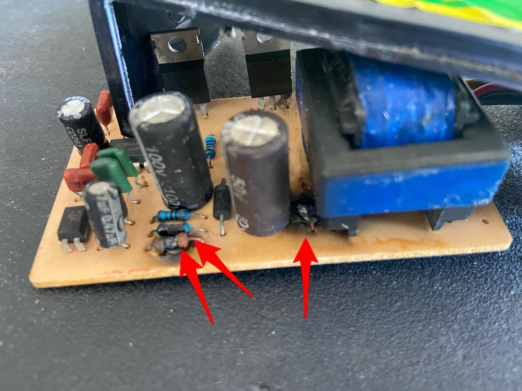 Ich habe auf den Bildern mit Pfeilen markiert welche Bauteile "abgeraucht" sind