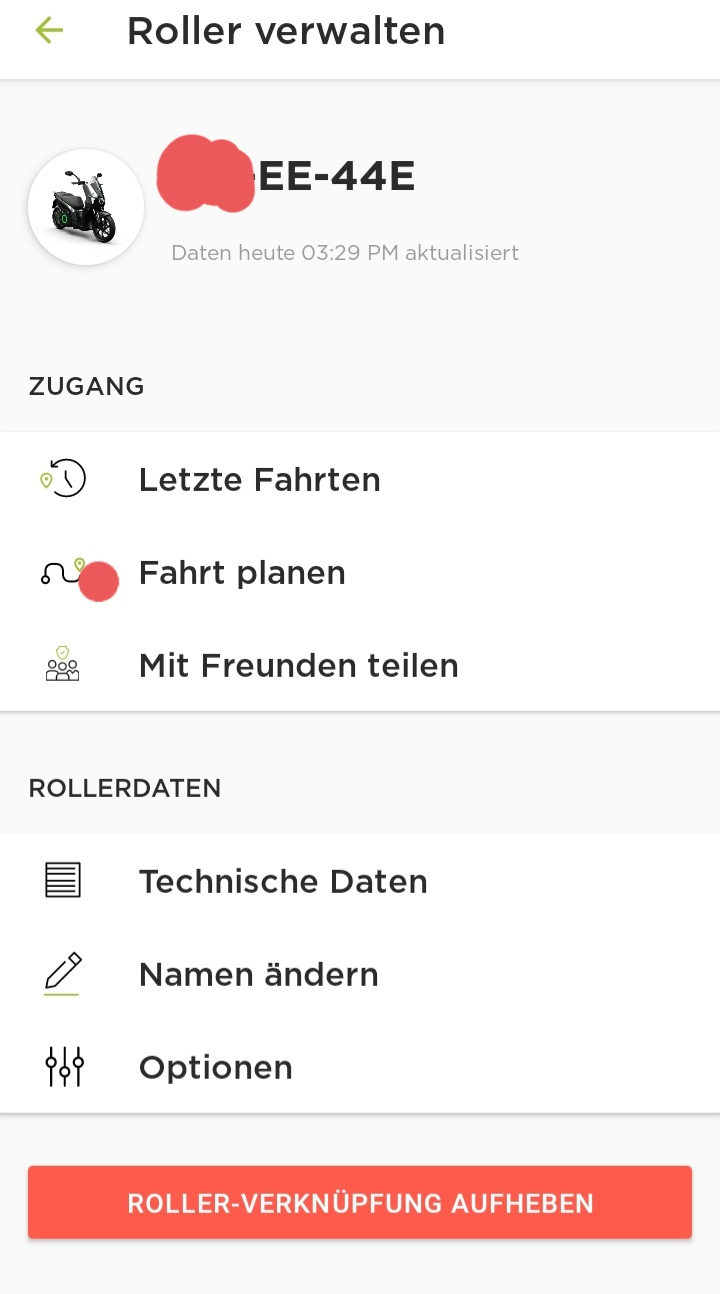 - In der App, siehe Screenshot, lässt sich eine Verbindung zu einem bestimmten Roller löschen.