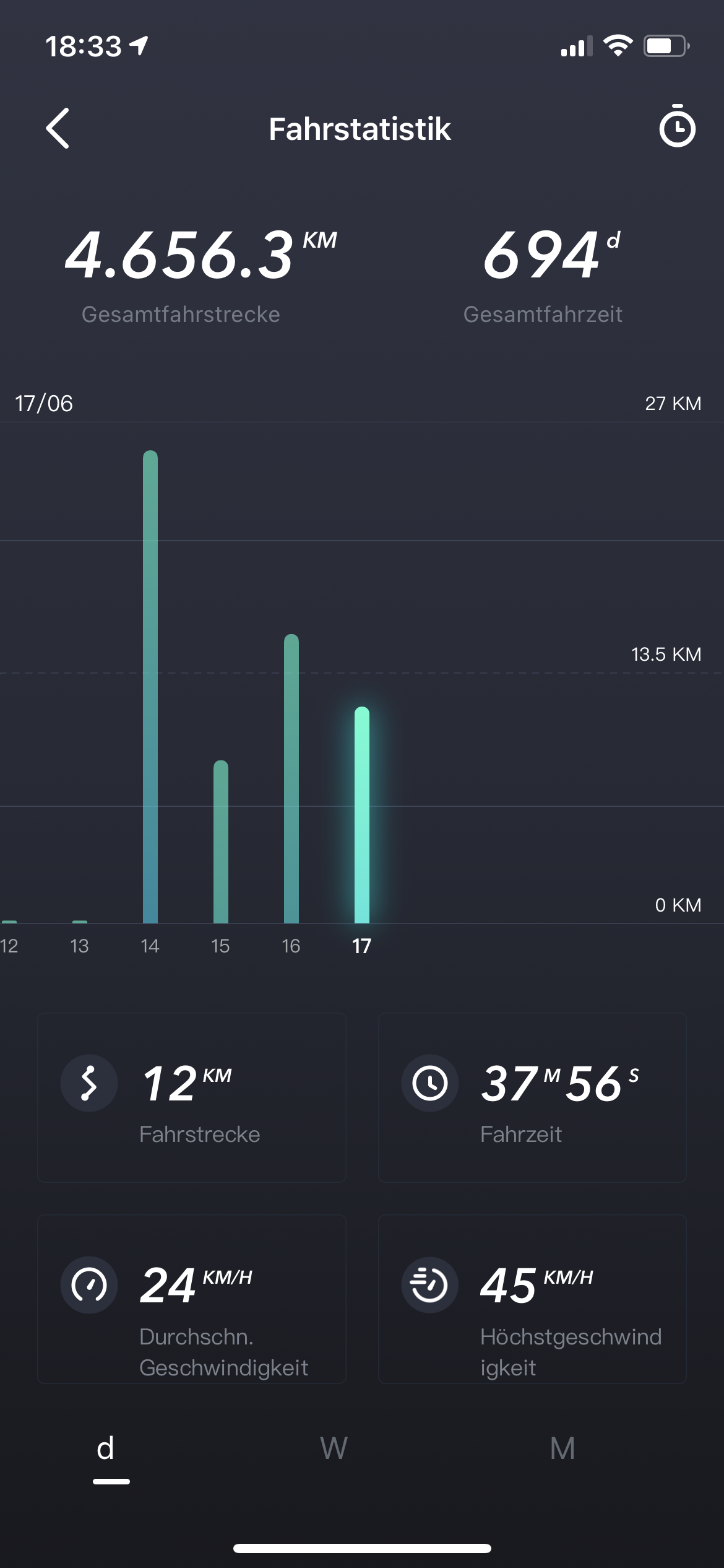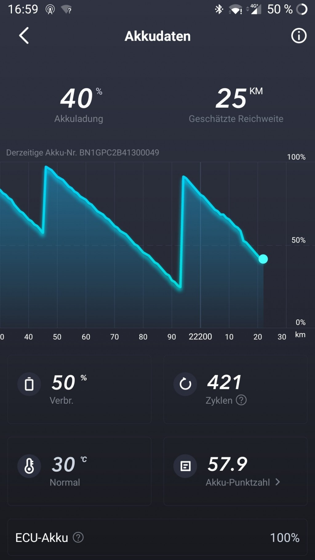 Die Fahrt bis km 22190 waren übrigens 48 Niu-km (44km real) von 100% auf 25%. Der Akku hat m.M. nach noch nichts von seiner Kapazität spürbar verloren.