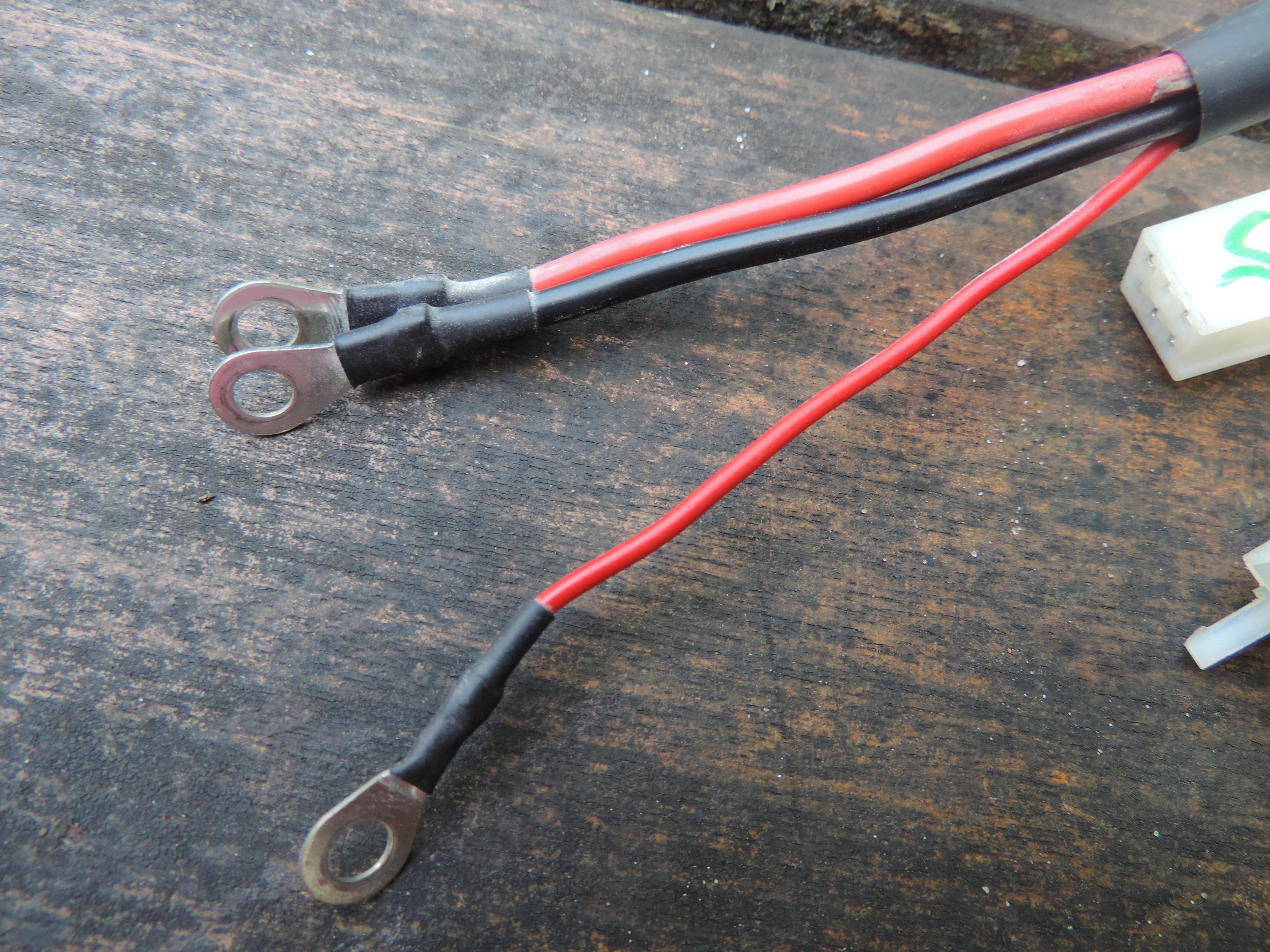 Die dicken Drähte (Schwarz und Rot) inkl. dem dünnen, roten Draht alle mit Ösen, werden an dem einen gelben Verteilerblock angeklemmt.