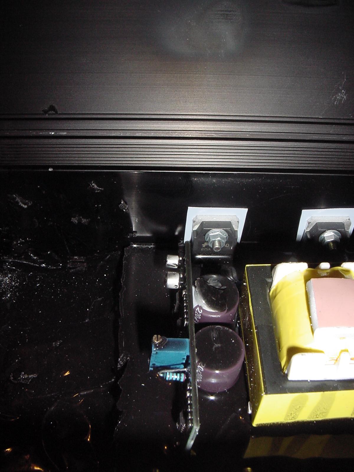 Habe natürlich das Gehäuse aufgemacht und reingelinst, musste aber etwas geschockt zur Kenntniss nehmen, dass fast der komplette Inneraum etwa 3cm tief mit schwarzer Vergussmasse zugekleistert ist. Oben gucken nur noch eine große Drossel und der Übertrager-Trafo sowei eine kleine Platine mit ein paar ICs raus. Was eine Fehlersuche unmöglich macht :evil: Und auch ein bisschen erklärt, warum der Gehäuseboden so heiß wird, denn dort unten entsehende Wärme kann nur dort unten raus, so eingesperrt wie das alles ist.