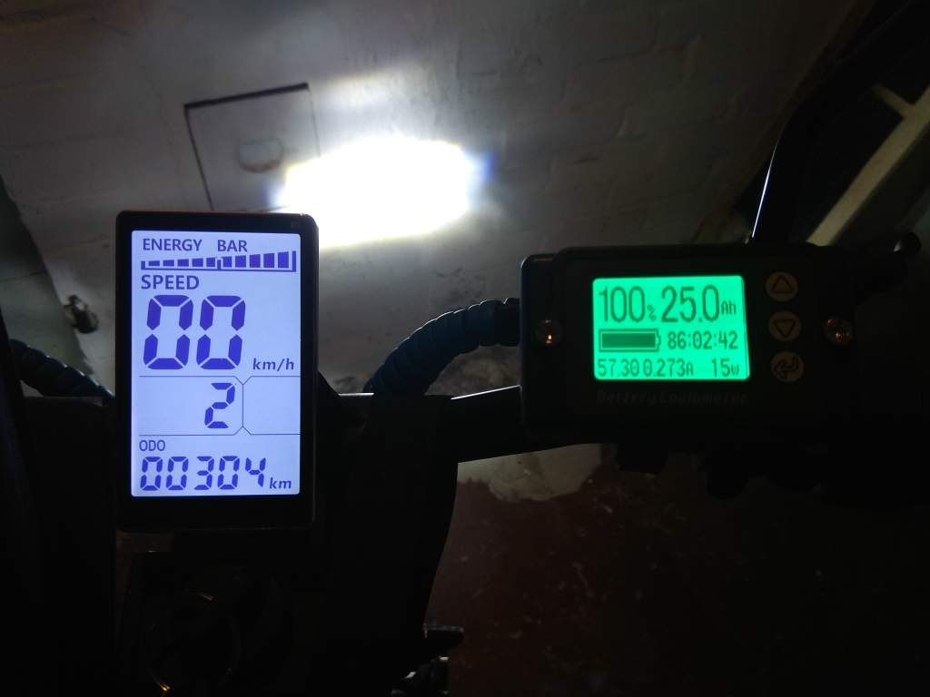 heute kam endlich für das coulometer das verlängerungskabel, dass zu kurze originalkabel wieder raus und die verlängerung rein. so konnte ich auch die schon vorbereitete halterung für das coulometer angeschraubt werden. passt und alles gut im blick. am späten nachmittags dann mal ne größere runde gedreht um zu sehen wie der verbauch ausschaut und wie sich das coulometer macht. muss sagen haut sehr gut hin, richtig guten überblick über den akkuverbrauch und auch die leistungsaufnahme. die angezeigten werte scheinen sehr plausibel zu sein. interessant ist vor allem die amperezahl die der motor zieht. konnte beobachten das bis zu 27,8 ampere gezogen werden beim anfahren oder wenn es bergauf geht. der controller leistet bis zu 30 ampere. also sollte das alles passen.