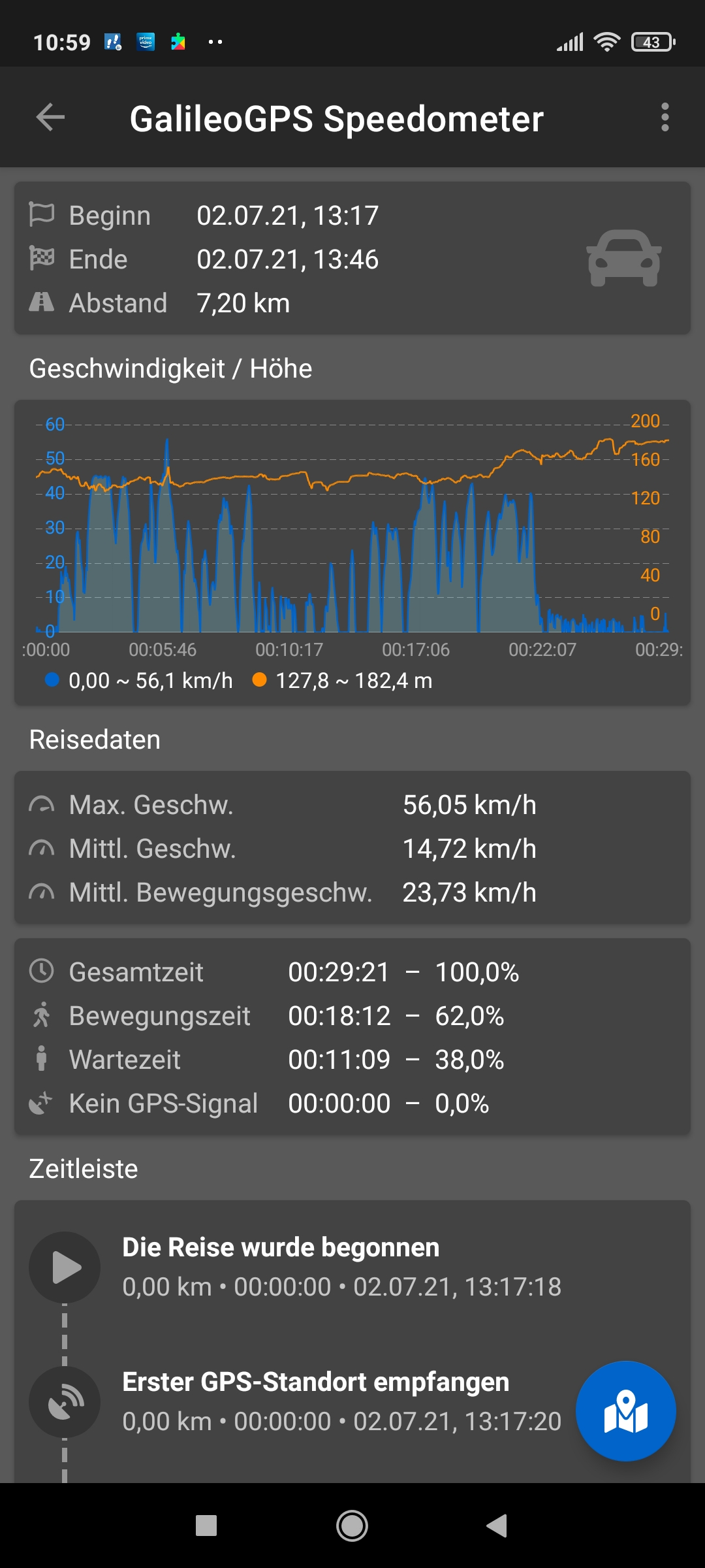 Hier noch ein Screenshot aus der GalileoGPS App. Hier war allerdings der Luftdruck vorne 1,8 und hinten 2,2 Bar. 56 Km/H in einer flachen 60er Zone gemessen und schön warmes Wetter