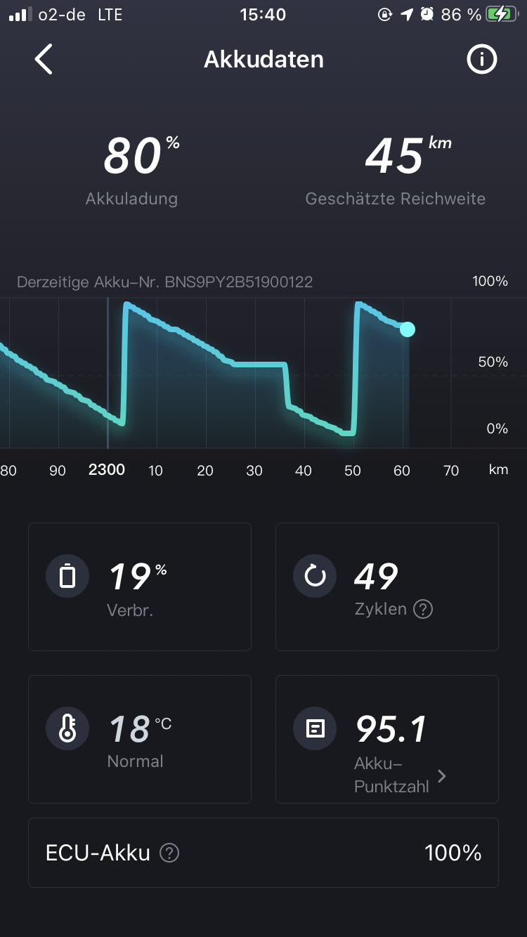 Ab und zu fehlt in der App in der Fahrstatisik aber einzelne Fahrten komplett, so das die dort erfasste Kilometerleistung nicht mit der Gesamtlaufleistung übereinstimmt.