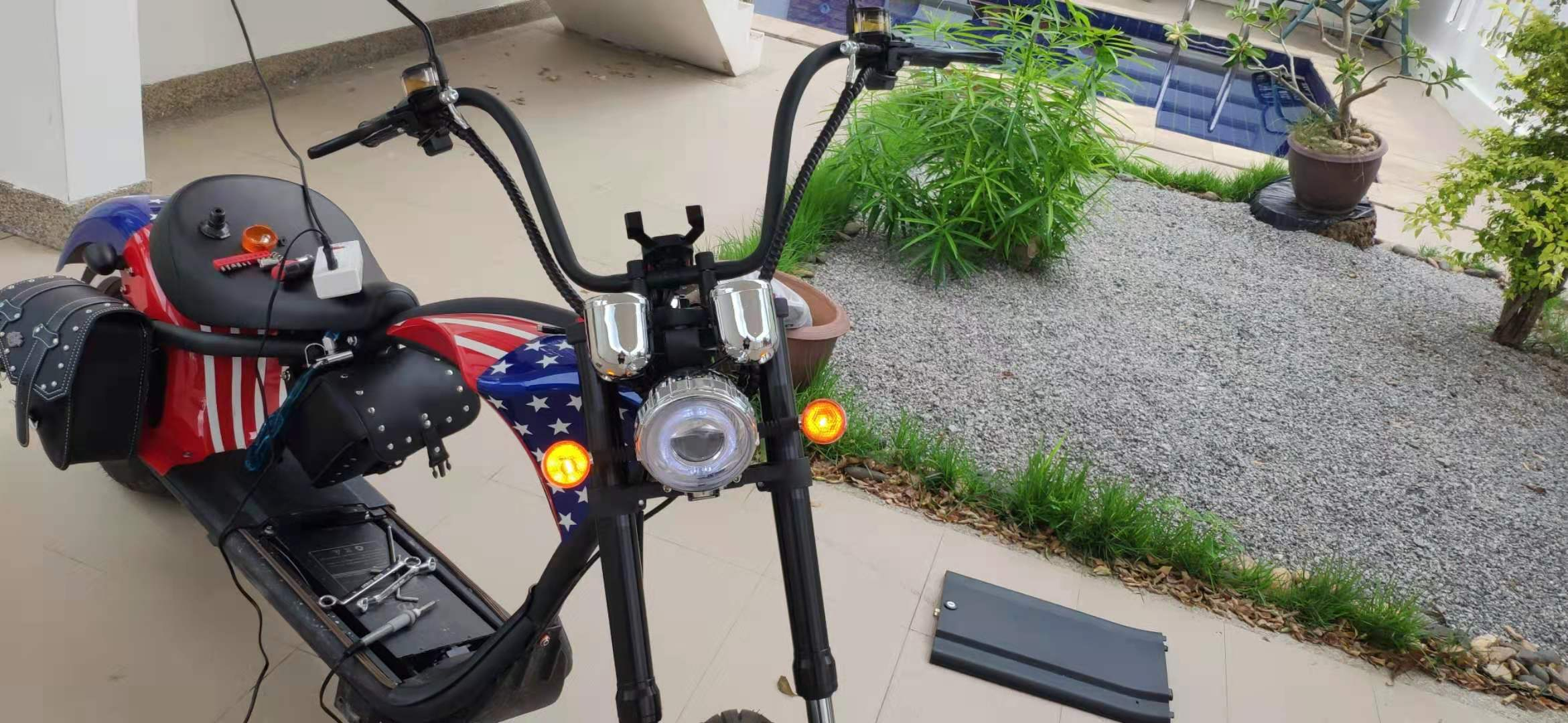 Somit beleibt der original Lader mit 64V einstellung zu hause. Ich habe mir auch ein zweites 10m Netzkabel in meiner offenen garage (Thailand typisch) an eine hoch angebrachte und von drinnen abschaltbare steckdose mehr oder weniger fest angebracht. Es wird normal aufgewickelt und auf Kopfhöhe ausser sicht unterm dach hingehängt. Damit wird das aufladen zuhause ohne die batterie jedesmal rauszunehmen auch einfach.