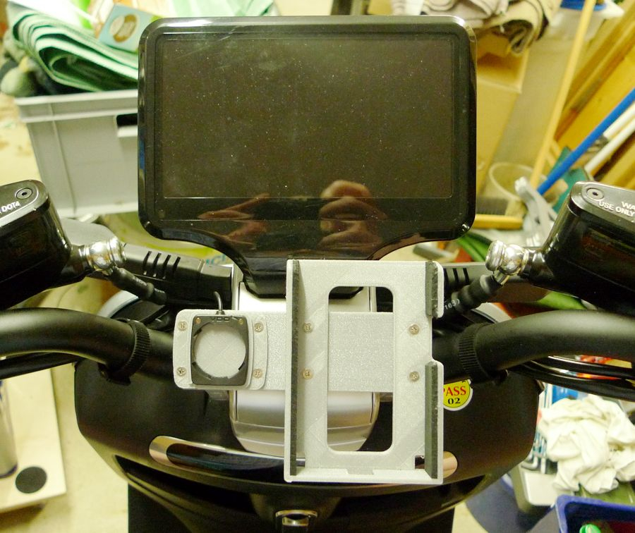 Ich habe mir mit dem 3D-Drucker was gebaut. Die Lenkerrohre sind ja konisch, aber gleich neben der Klemme in der Mitte sind sie noch ein paar Millimeter zylindrisch, da kann man bequem was festklemmen.