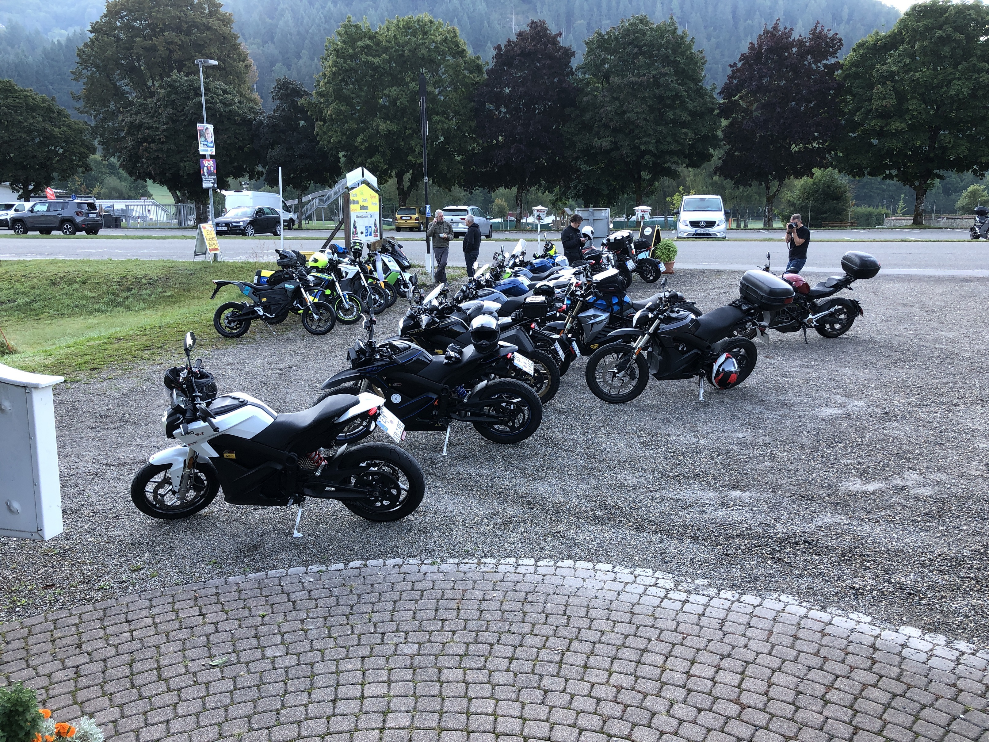 Um 18:15 Uhr schwang ich mich wieder auf Zero, kurvte die schöne Strecke bis Schönau runter, und kam mit jetzt 37% an der Pizzeria in Schönau an, wo wir ab 19 Uhr 4 Tische im Freien reserviert hatten. Viele bekannte und neue Gesichter gab es zu begrüßen, doch eine Menge der Teilnehmer war noch unterwegs, alleine 4 mit zwei Auto-Gespannen mit je 2 Moppeds drauf aus Berlin, um den Zero Pionier gruppiert. Teilnehmer aus Österreich, Belgien und scheinbar noch weiter her auf eigener Achse meldeten sich per der Signalgruppe, sendeten jeweils den Standort beim laden, und konnten so schlussendlich bis zur Pizzeria geleitet werden.