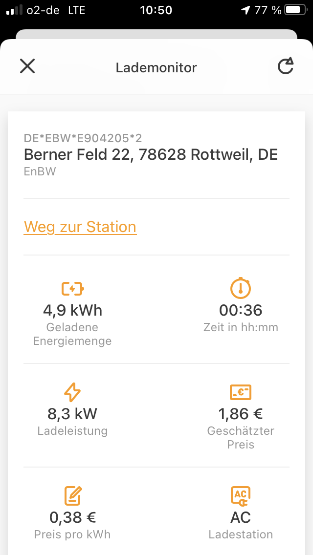 Dann ging es auf A81 bis Geisingen, etwas südlich von Donaueschingen, und weiter bis Löffingen, wo es einen zweifach Lader geben sollte. Ich musste ganz schön suchen nach dem Teil, weil es auf einem Firmenparkplatz bei einer Riesen-Schule war. Auch dort wollte der Onboard nicht mit anspringen, habe also wieder nur mit 6,6 statt 7,6.. 7,9kW geladen: