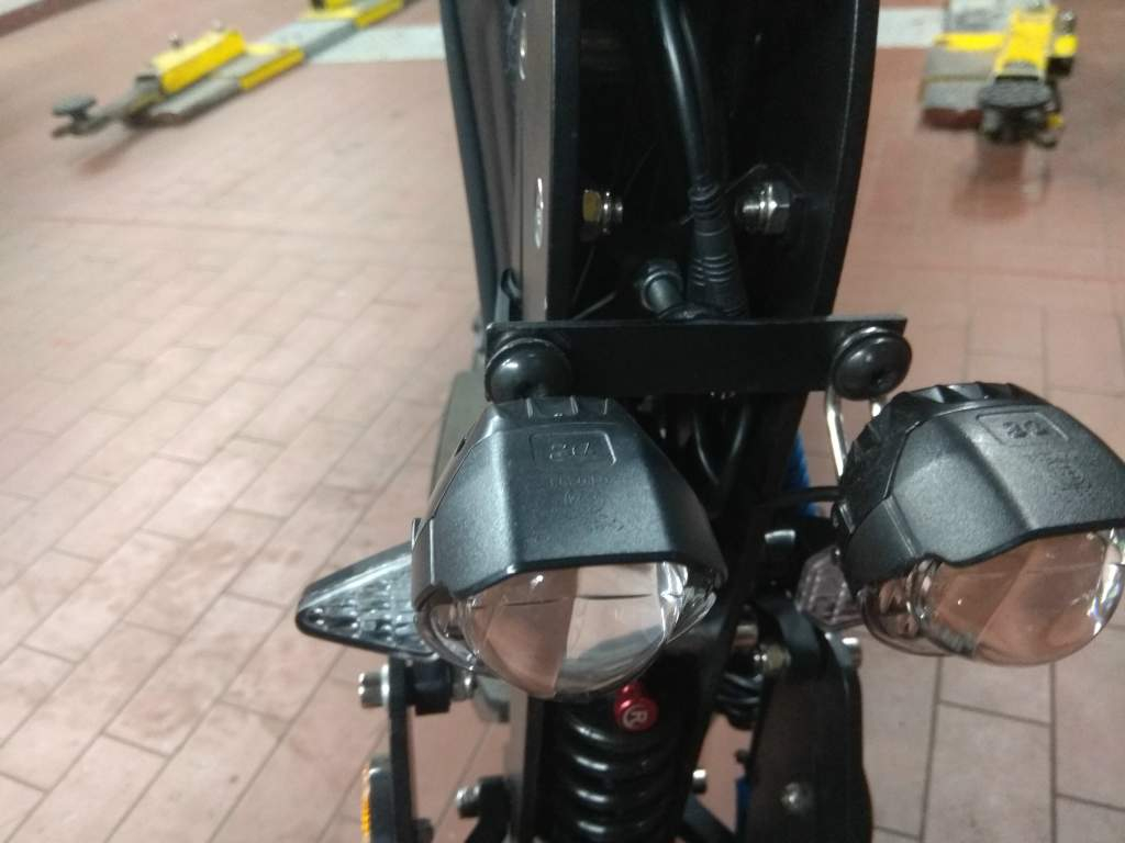 ich hab einfach ein stück flacheisen was ich auf arbeit noch rumzuoxidieren hatte genommen und auf passende länge geschnitten, an die enden zwei löcher gebohrt wo ich die lampen anschrauben kann. dann mittig eine passend lange schraube geschweißt. um das ganze in das originale loch im scooter zu stecken und dann das ganze nur mit zwei muttern festgeschraubt. die eine mutter als anschlag und die andere zum festschrauben. das ganze noch schwarz lackiert und fertig. ich mach dir mal noch eine nahaufnahme