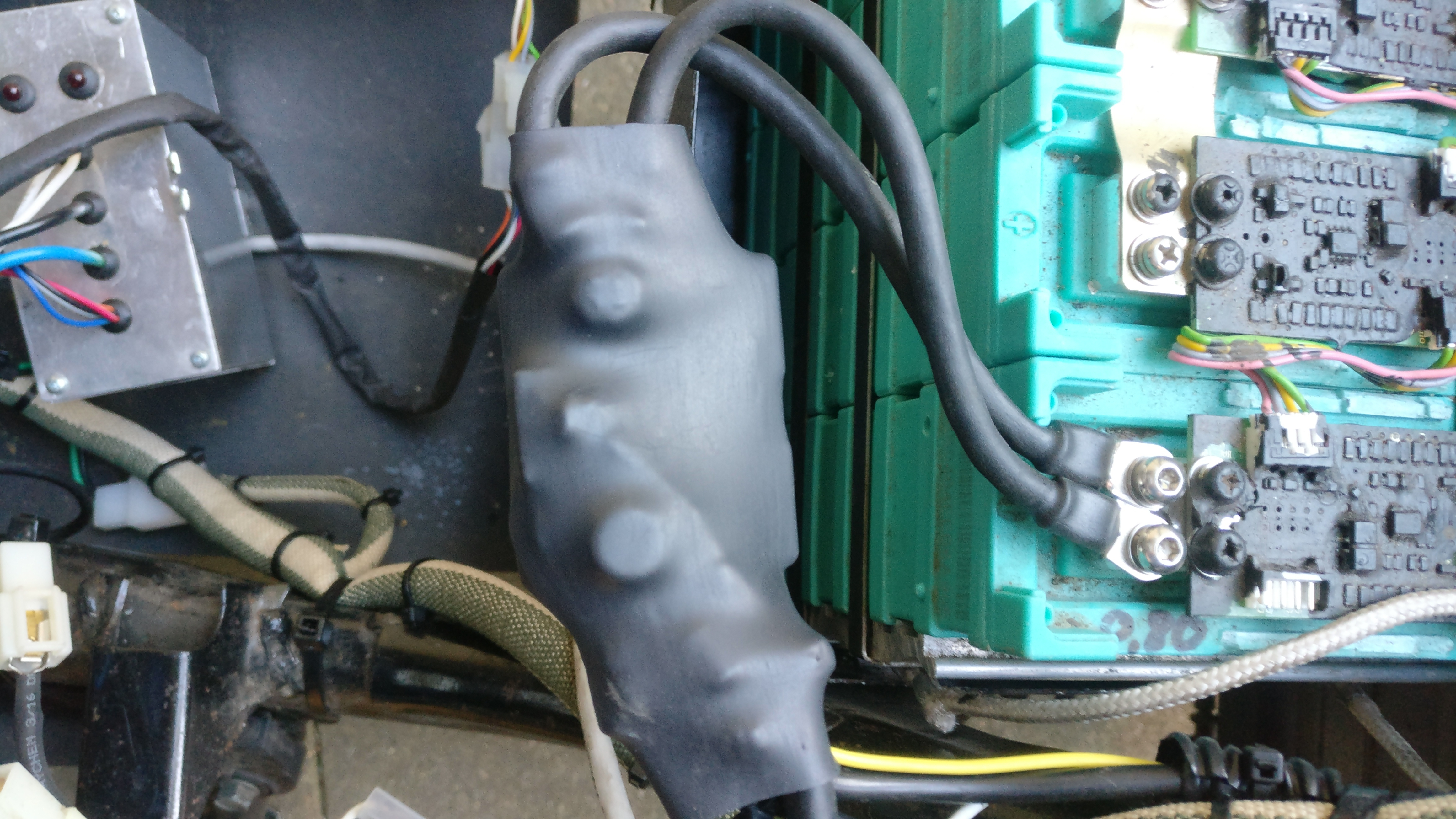 Ich habe das Zentralminus an der letzten Batterie gelöst und da doppelt 5 cm mit doppelter Ringöse eingesetzt.