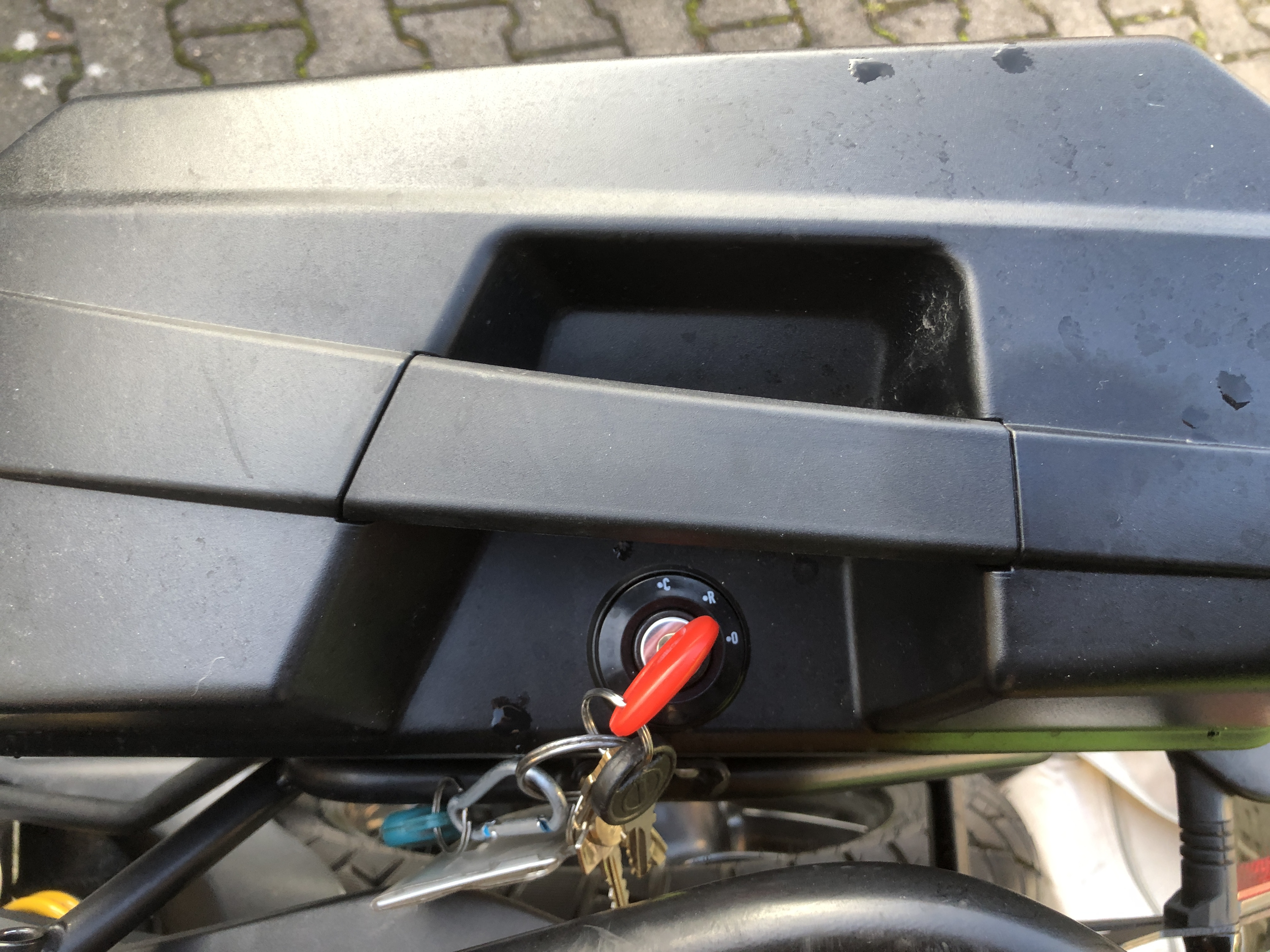 Weiter geht's! Die Koffer an sich haben das für Givi typische Monokey System. Wenn der Schlüssel 90° quer zur Fahrtrichtung steht kann er abgezogen werden. Abnehmen kann man den Koffer nach einer 45° Drehung, und man muss zum Entriegeln den Schlüssel samt Schloss nach unten drücken, dann kann man den Koffer seitlich abnehmen: