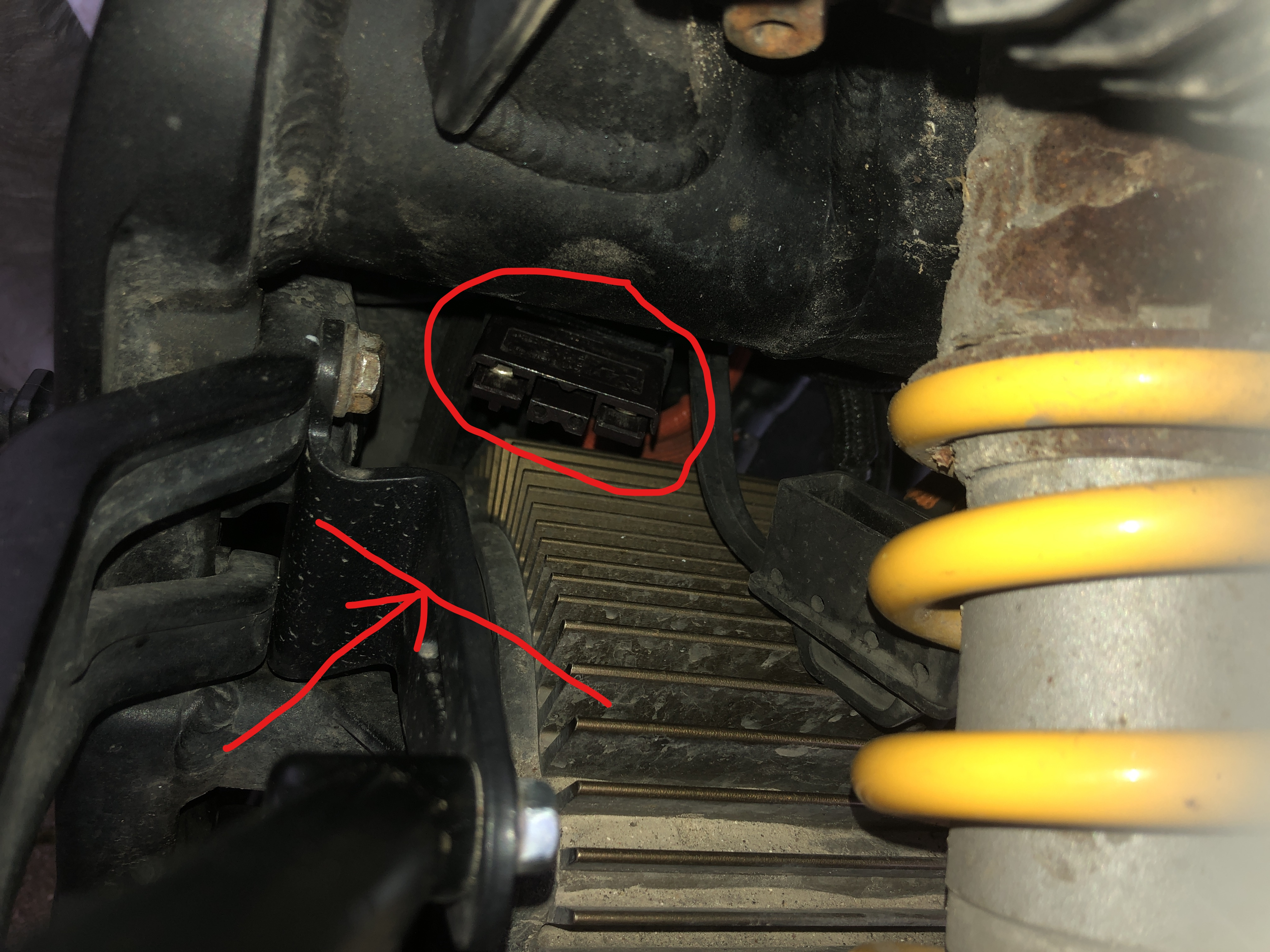 Der Blechhalter, der links unten den Seitenkofferrahmen abstützt, steht so weit in den Innenraum, dass er es unmöglich macht, den braunen Anderson Stecker eines Zusatzladers in den schräg nach unten links stehenden Gegenstecker über dem Motor einzustecken :evil: